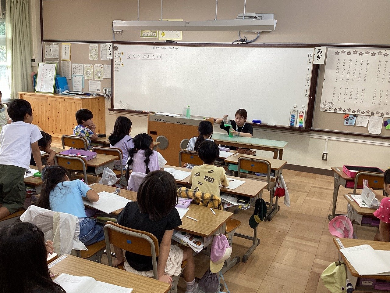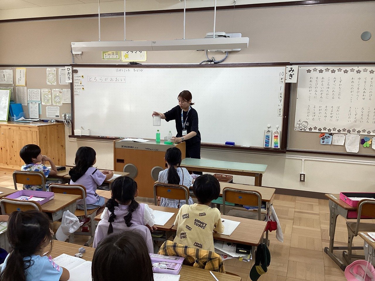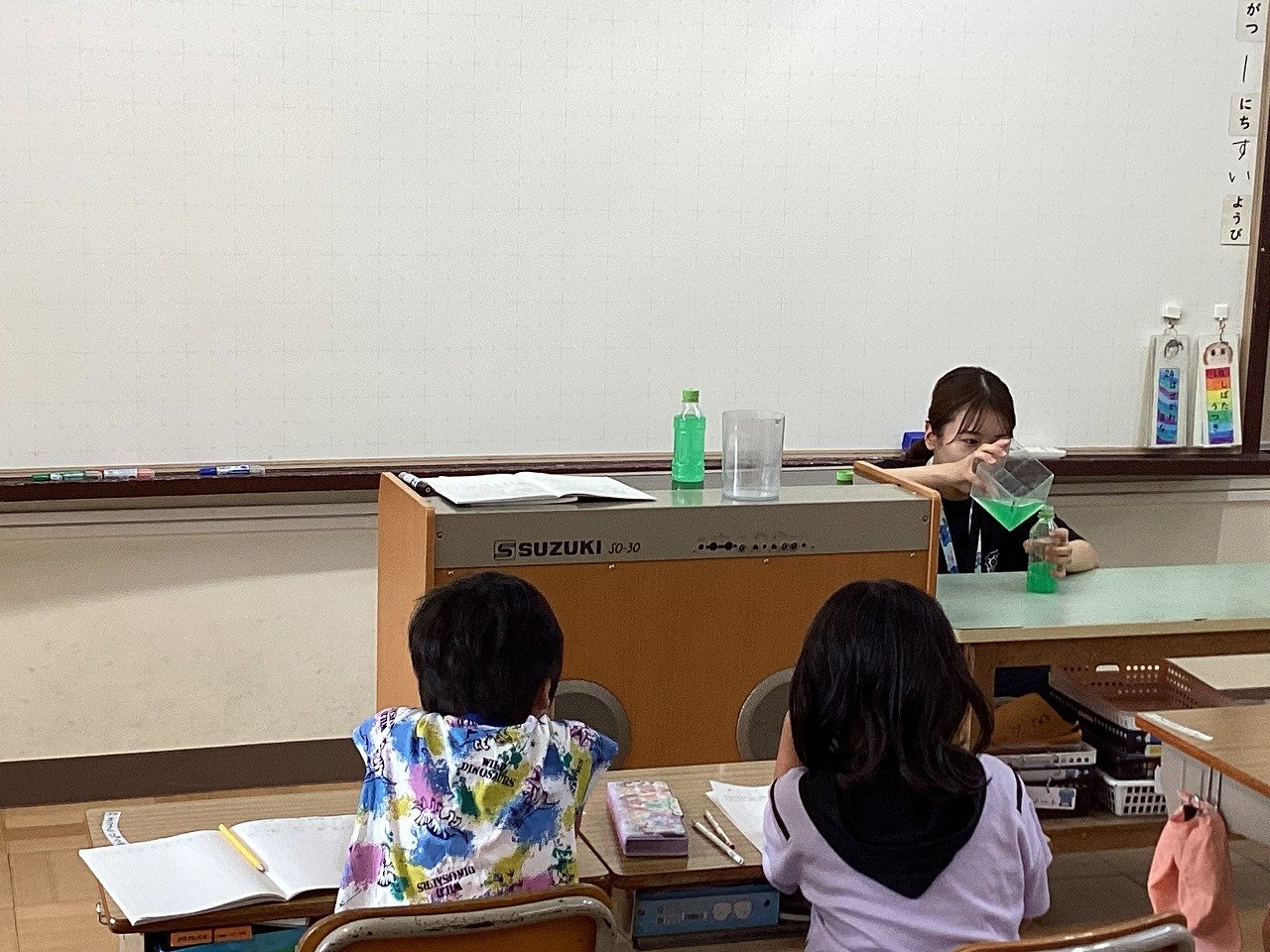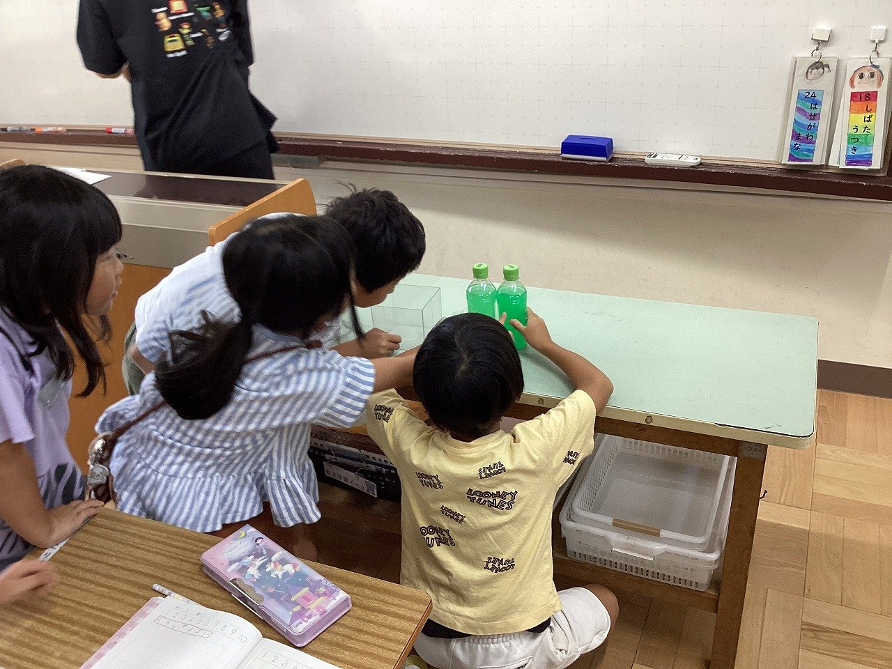 「先生が今から魔法を使ってペットボトルに入っている水を緑色にします」と言ってペットボトル振ると、なんと一瞬にして緑色に変色しました。「え~、なんで!」子どもたちは目をパチクリしながら、見ていました。