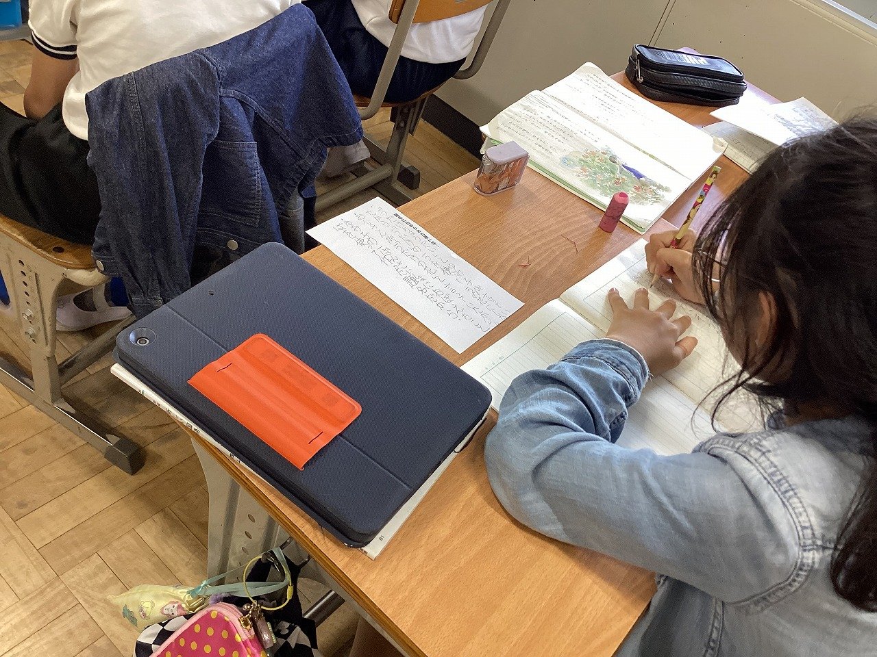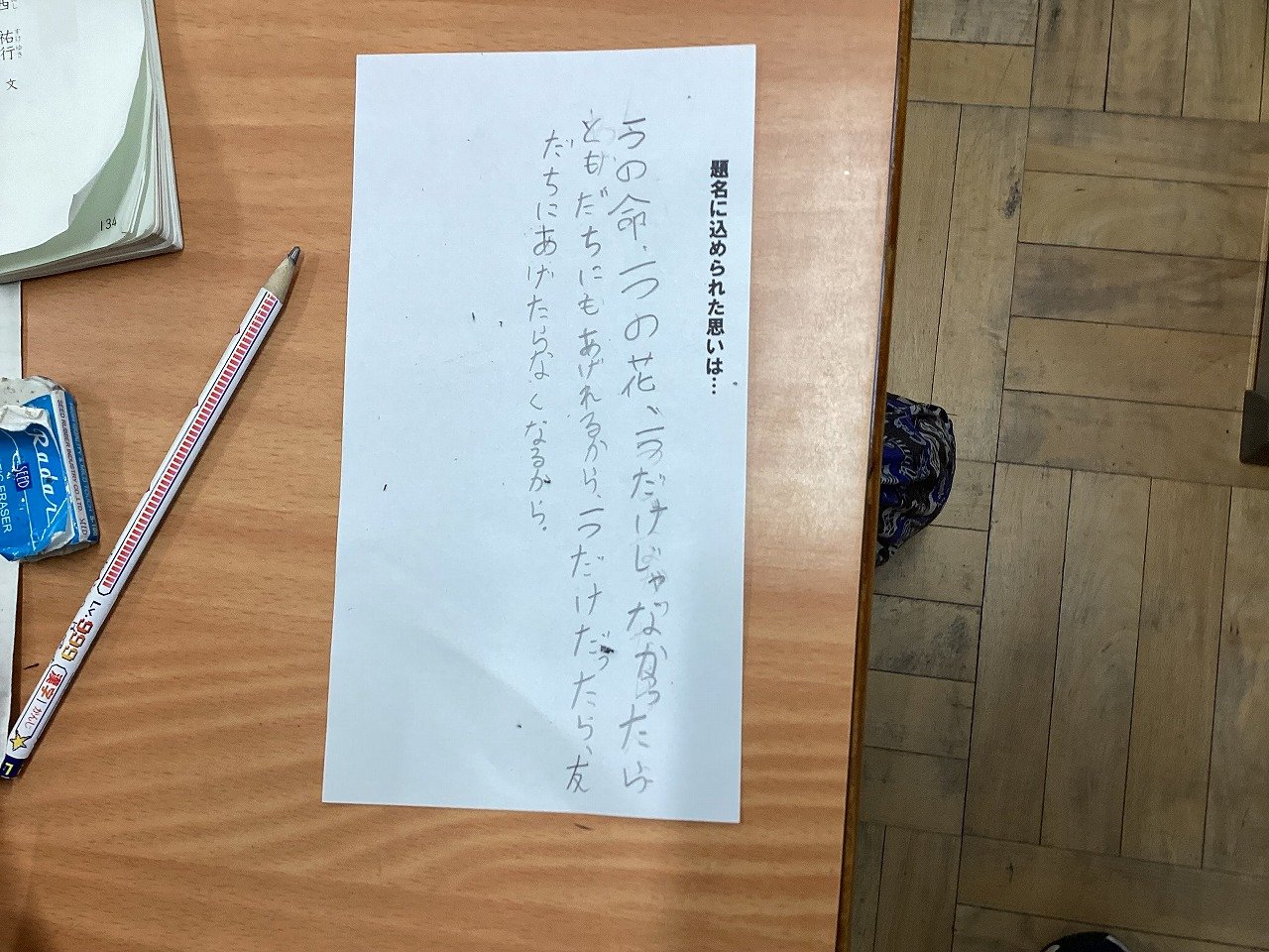 今日は物語教材「一つの花」の最後の授業です。子どもたちは、これまで学習してきたことを思い出しながら、題名に込められた思いを考えていました。