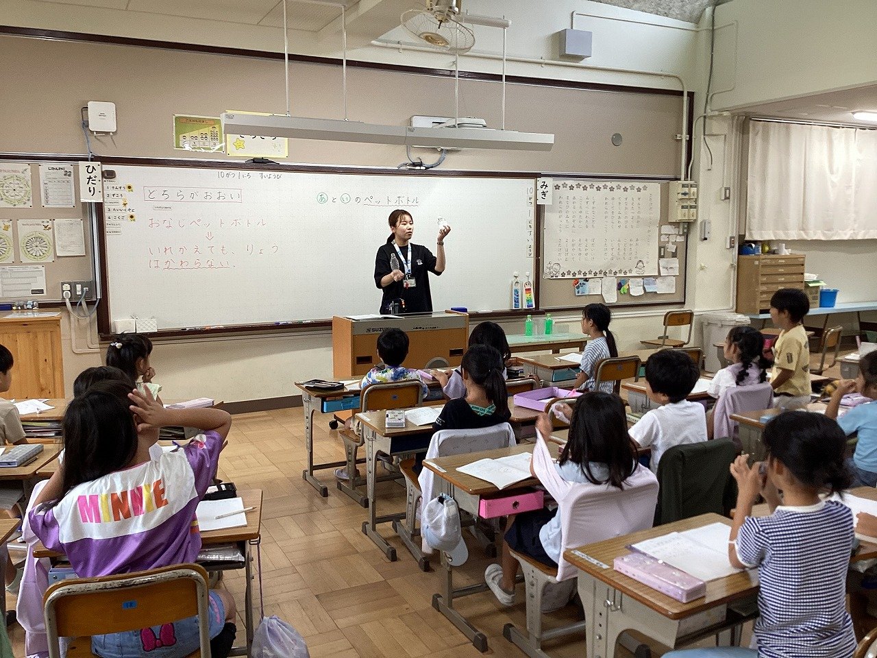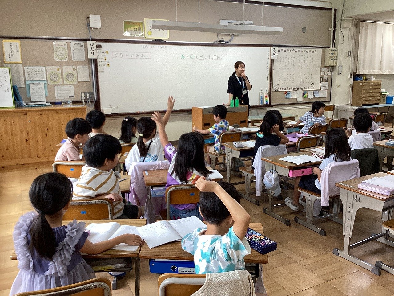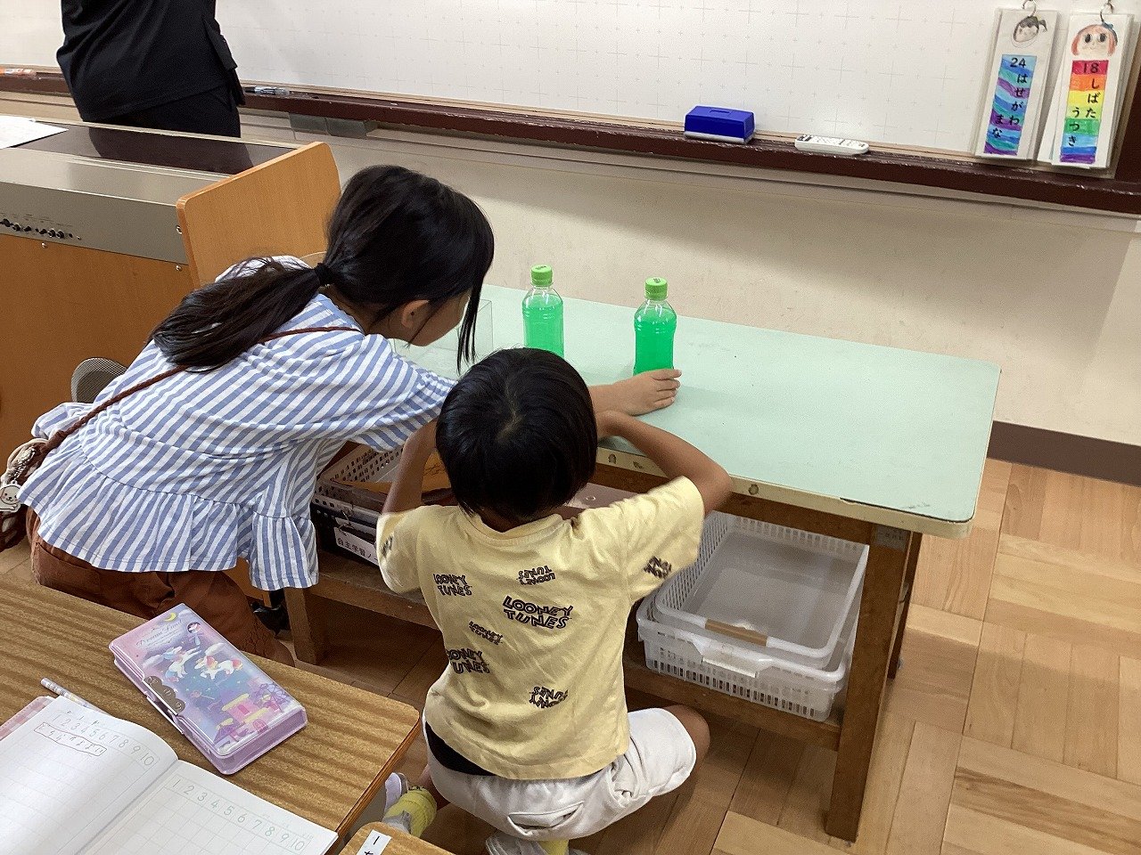 「この2つのペットボトルに入っている水は、どちらがおおいでしょうか?」と先生が尋ねると、子どもたちは「右のほうだよ」「いやいや左だよ」と口々につぶやいていました。