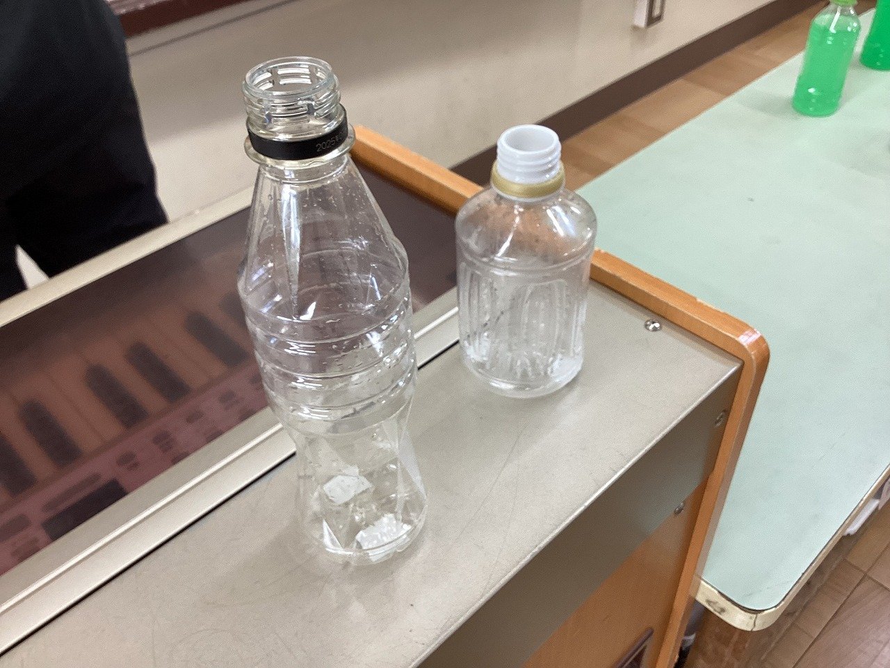 次に、高さも幅も形も違うペットボトルを用意し、「では、この2つのペットボトル、どちらがおおく水が入るでしょうか?」
