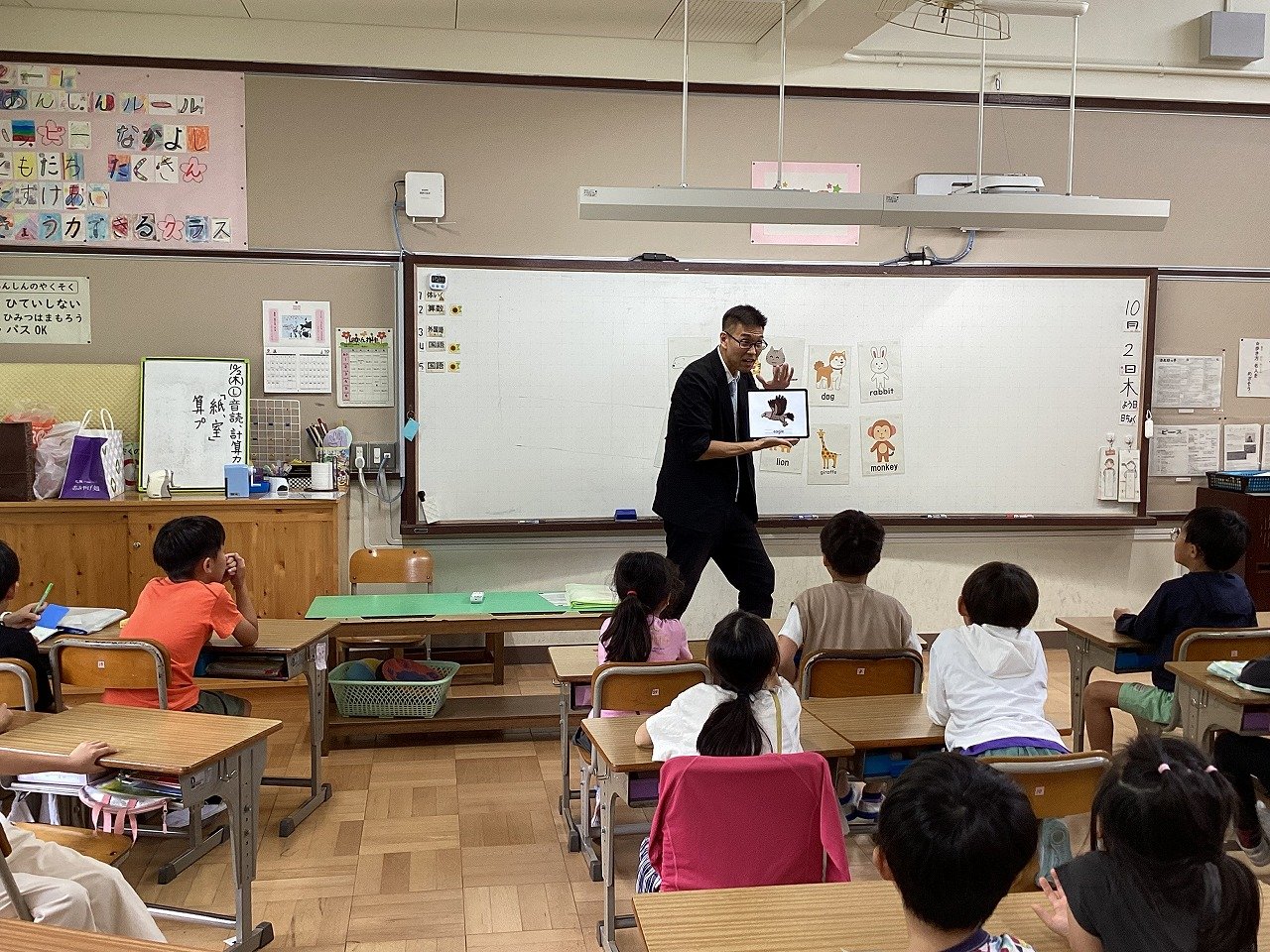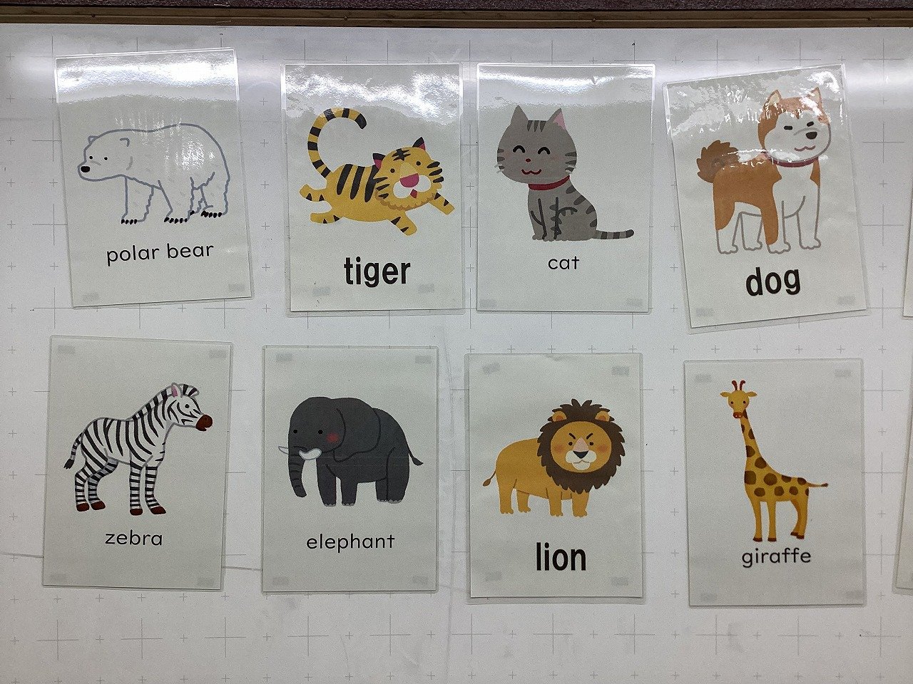 「What animal do you like?」 フラッシュカードを活用し、動物の名前を英語で言っていきます。
