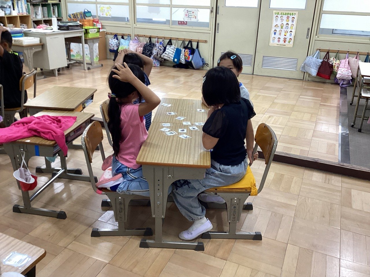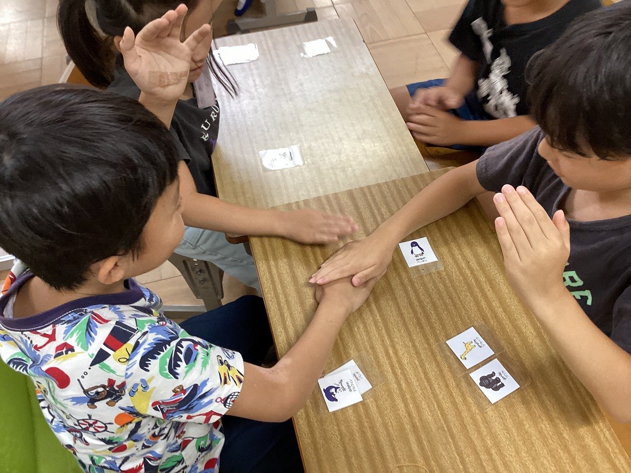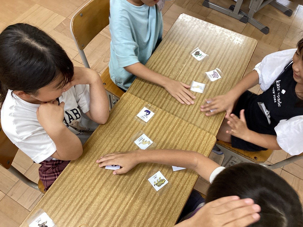 そして、グループに分かれてアニマルカルタを行い、英語での言い方を楽しく確認していました。 「What animal do you like?」とグループの人が聞くと答える児童が「I like ~.」と好きな動物を言います。他の児童は、その動物のカルタをいち早く取っていくというゲームです。