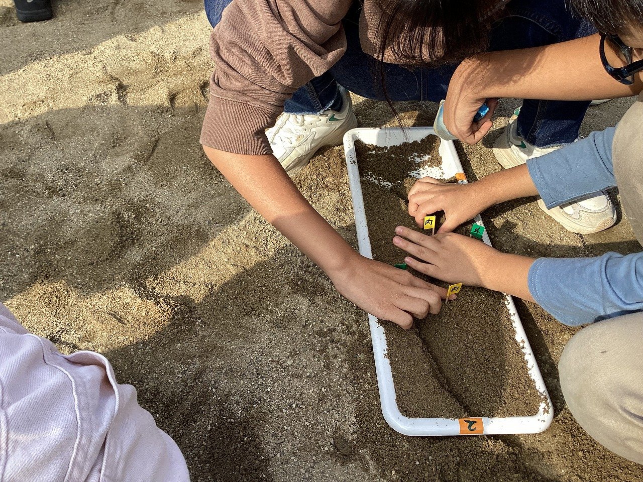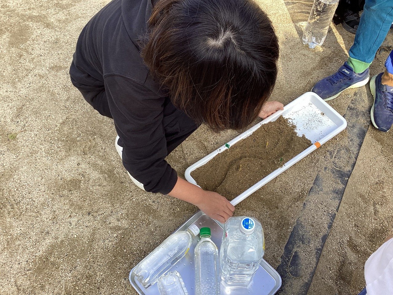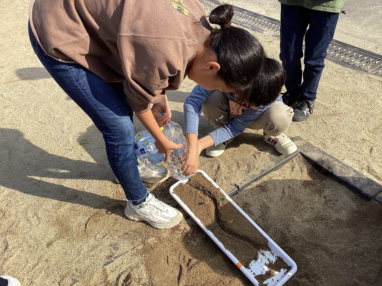 今日は、流れる水と地面のようすの実験をするために、プランターの受け皿に土をしいて地面をつくり、水が流れるみぞをつけて川に見立て、ペットボトルで水を流していきました。