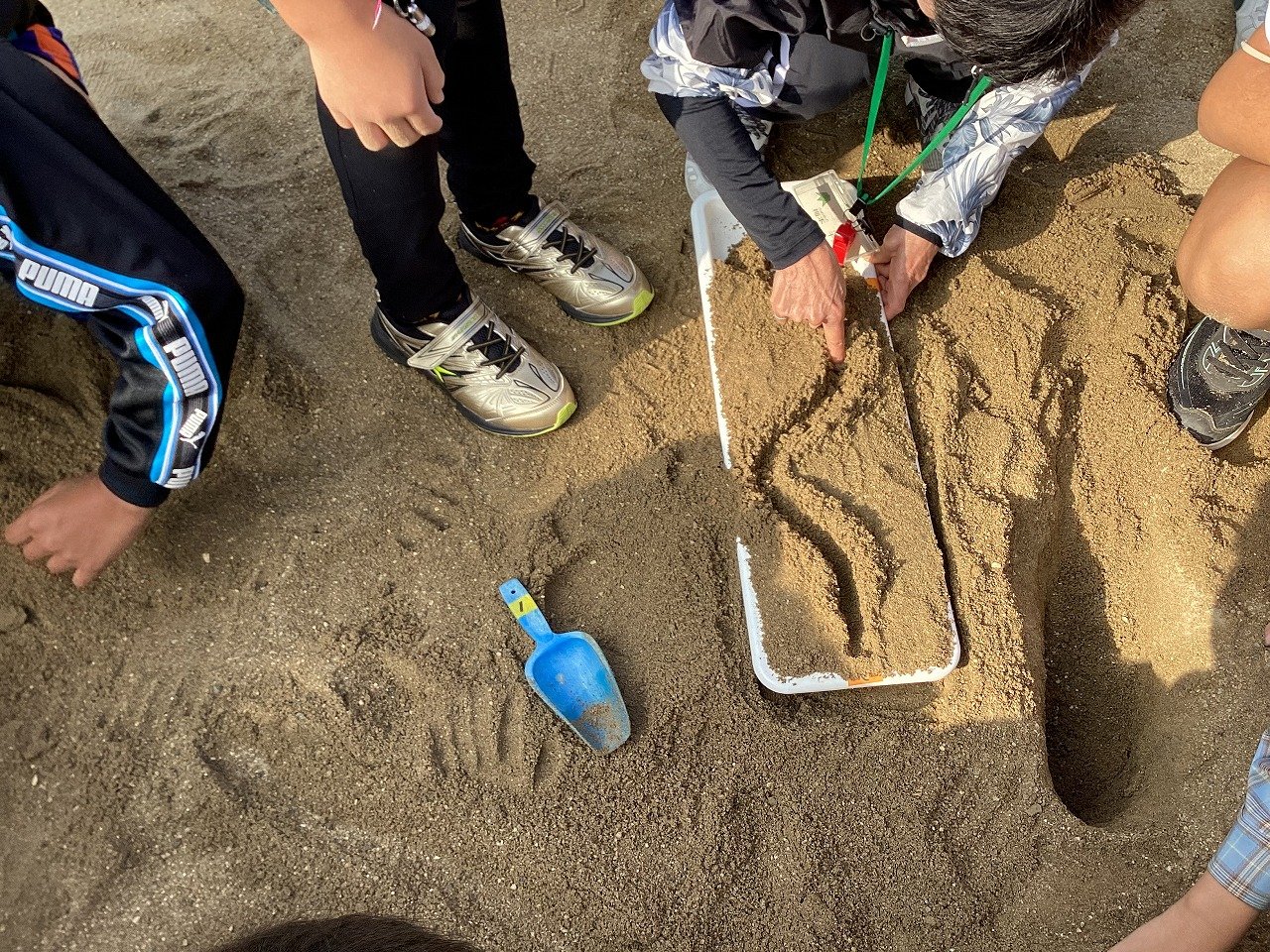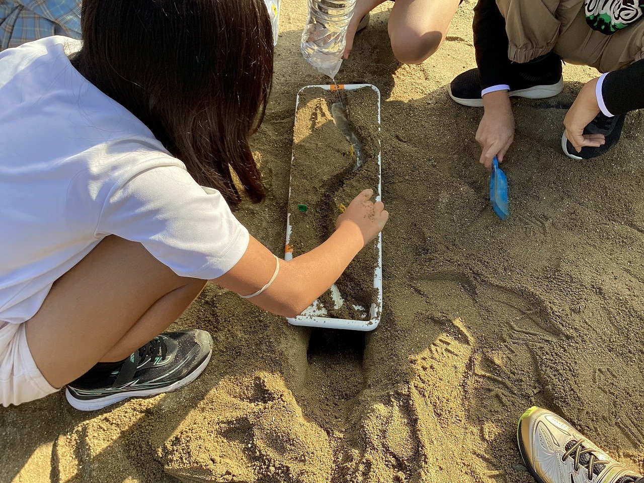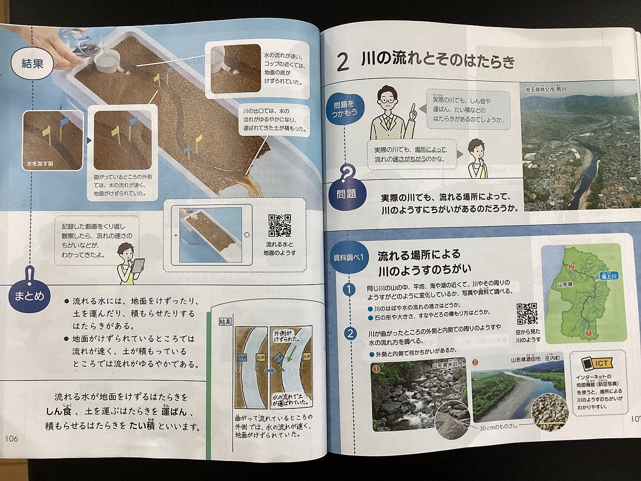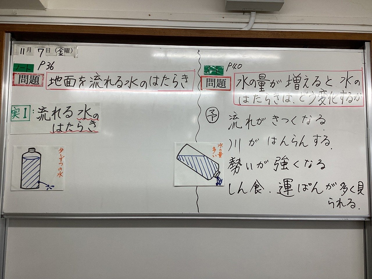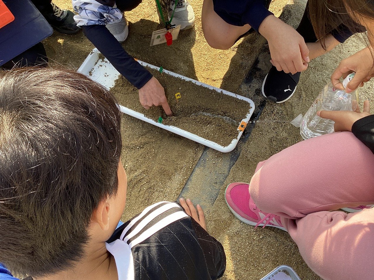 水の量を増やす実験前の予測では、「流れがきつくなる」「川がはんらんする」「勢いが強くなる」「しん食、運ぱんが多くみられる」という予測がでましたが、「水を流すとあっという間に流れるので、良く見えなかった」「みぞの外側と内側の違いが分からないよ」と声があがりました。