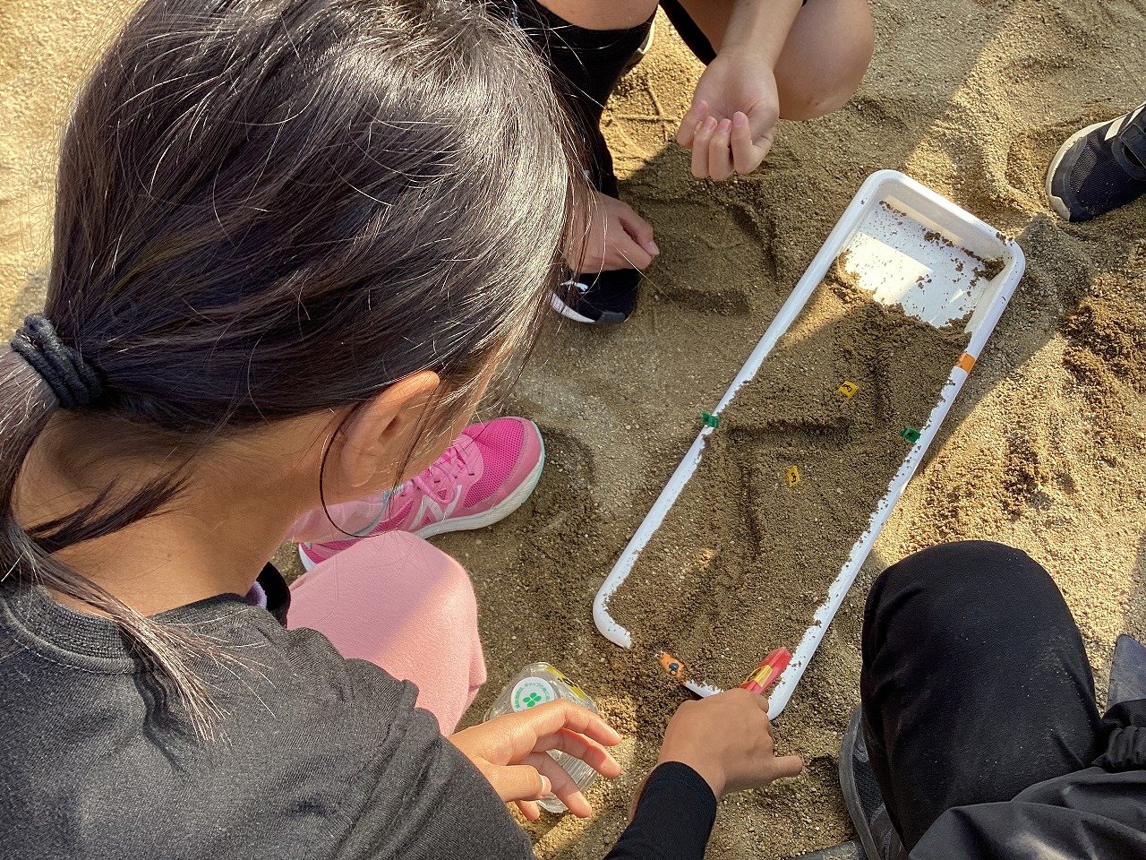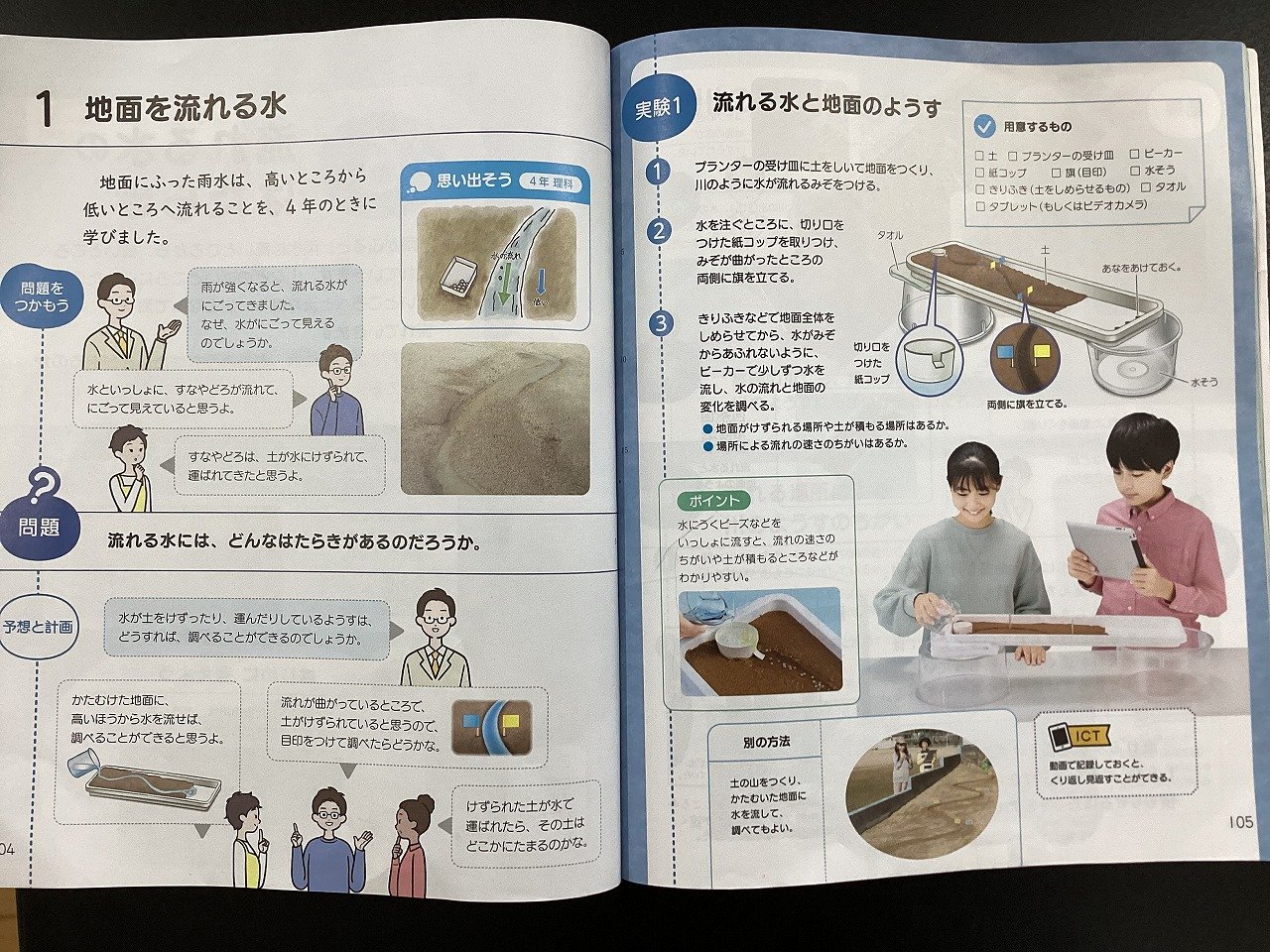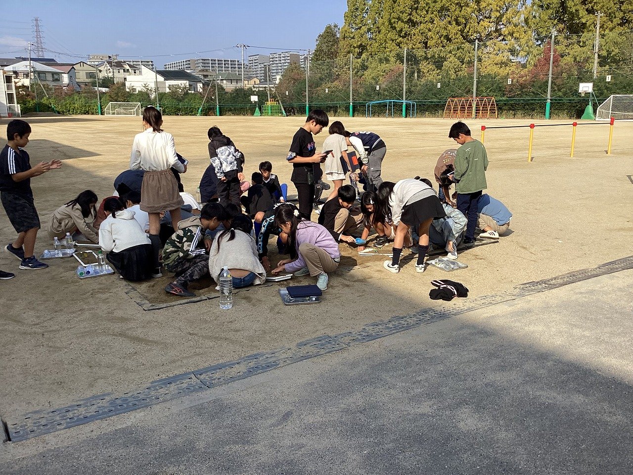 そして、地面を流れる水のはたらきはどんなようすなのか。また、水の量が増えると、水のはたらきは、どう変化するのか。この2つの実験を行い、タブレットで動画撮影をしていました。