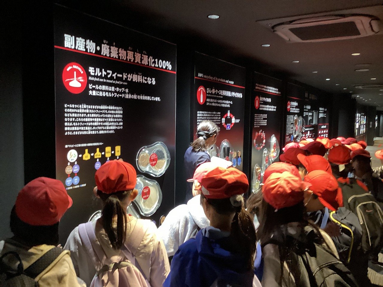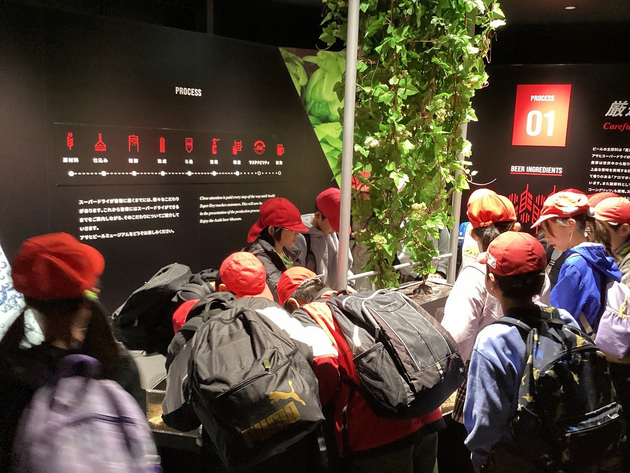 アサヒビール工場見学では、これまでの歴史やビールが出荷されるまでの流れの説明をしていただき、実際に瓶や缶にビールが注入されたり、瓶にラベルを貼ったり、ケースや箱に入れて出荷の準備をしている様子を見学しました。