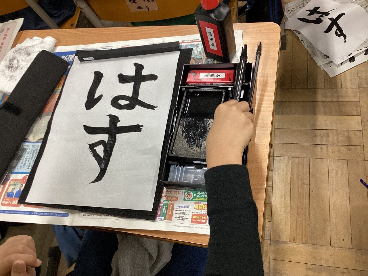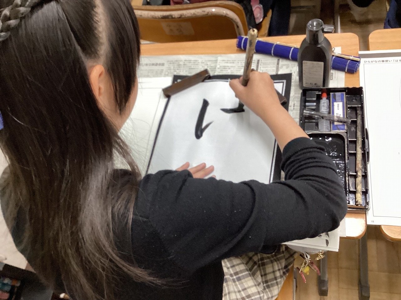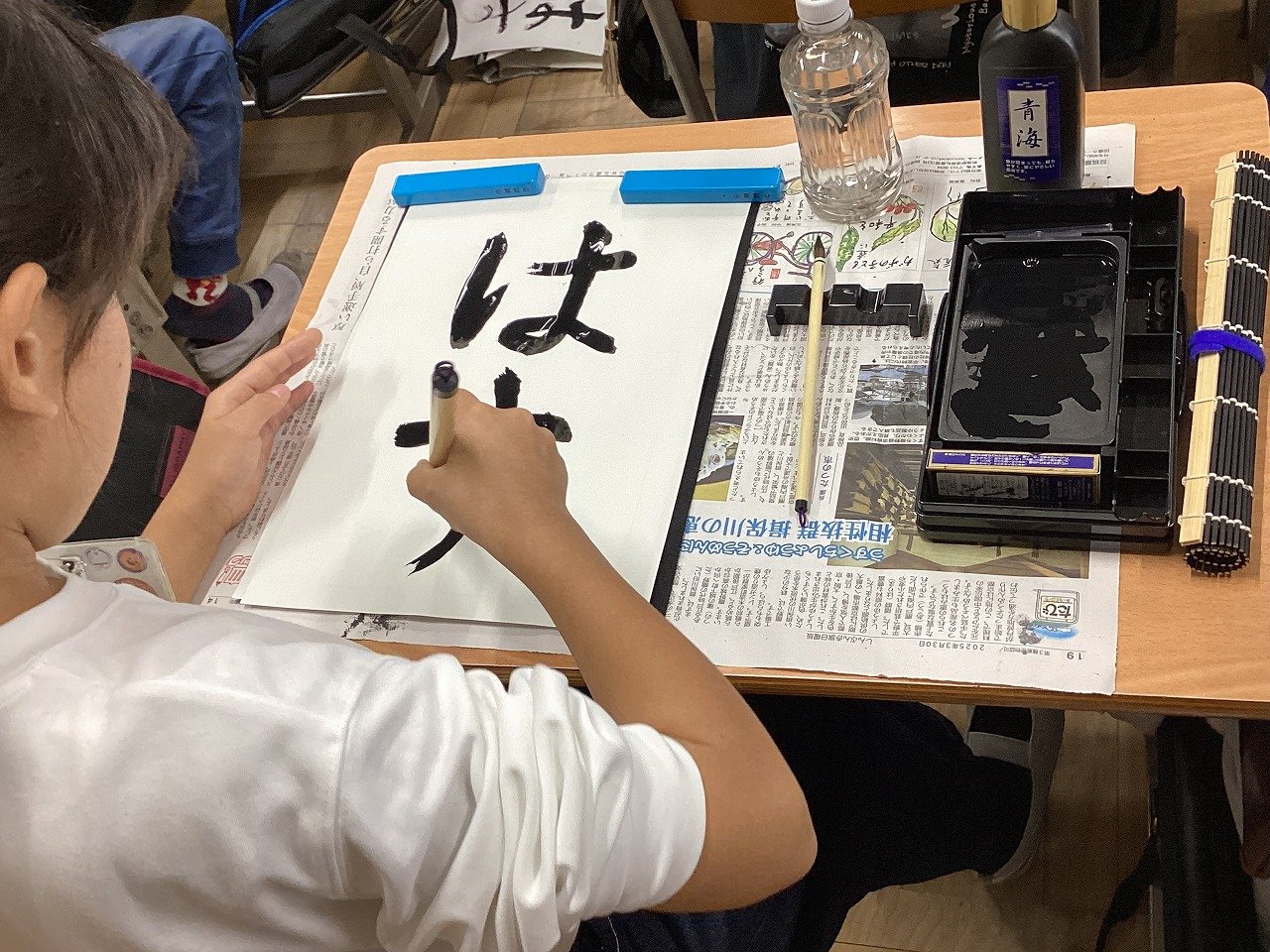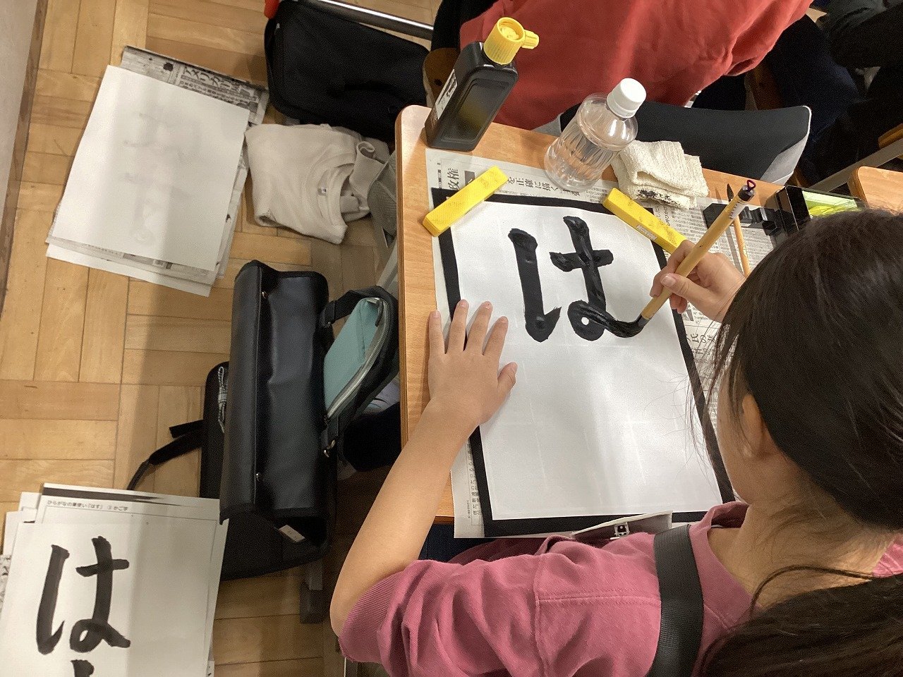 そして、精神集中して、いざ清書。ひらがなは、バランスをとったり、筆をくるっとまわして書いたりするところが難しいですが、丁寧に一文字ずつ集中して書いていました。