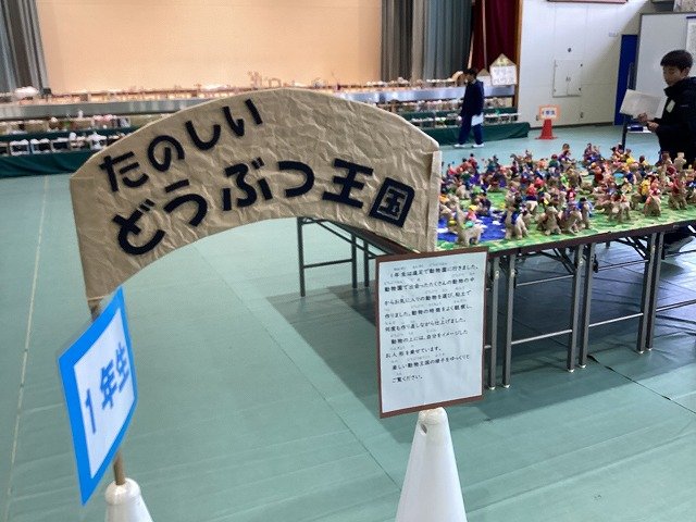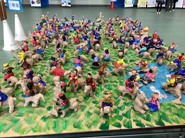 1年生のテーマは「たのしいどうぶつ王国」です。 粘土でお気に入りの動物を作り、その動物の上に乗っている自分の姿をイメージした人形を紙粘土で作成していました。躍動感あふれる素晴らしい作品になりました。
