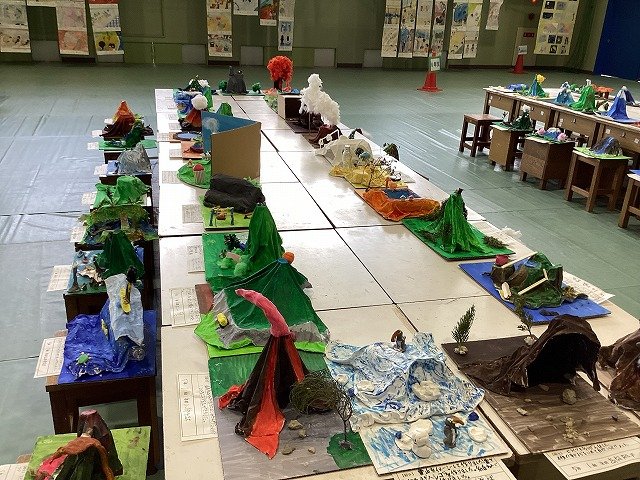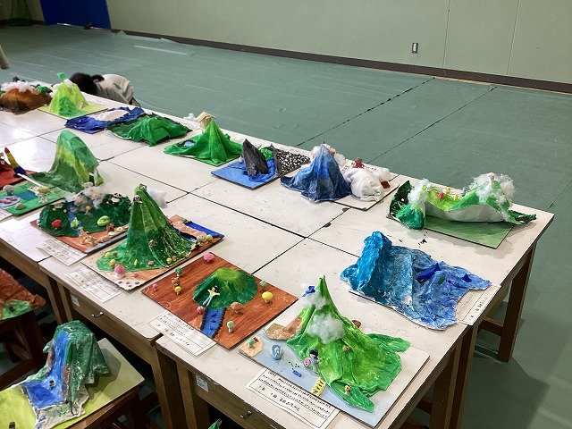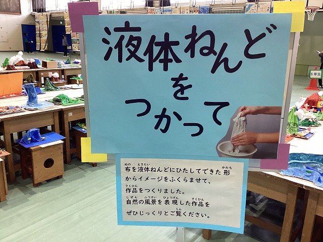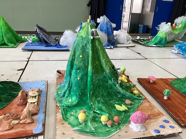 5年生は、液体ねんどで布を思い思いの形状に固定し、自然の風景を表現した作品です。木枝や葉、綿や一つひとつの作品から子どもたちの世界観を感じることができます。