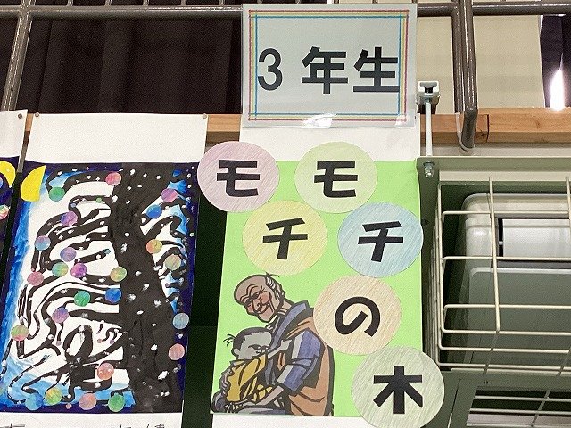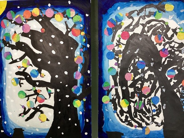 3年生は国語科で学習した「もちもちの木」がテーマです。木を墨で、月は大きさや貼り付ける場所を考え、雪は絵具で、光はクレパスで塗った丸画用紙を散りばめ、まめたの頑張りを表現した、なんとも幻想的な作品になっています。
