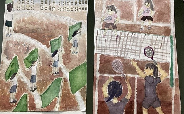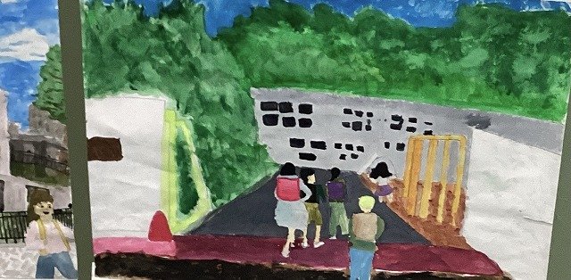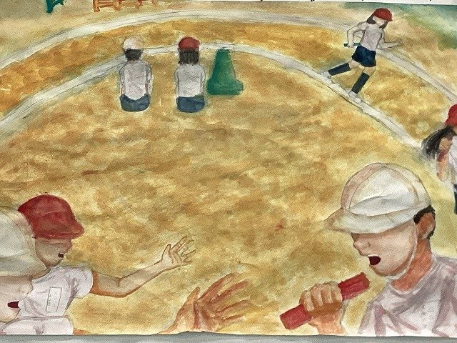 6年生は「思い出のワンシーン」の生活絵です。日常の教室や学校の様子や運動会、音楽会、修学旅行などの行事などのワンシーンを切り取った素敵な生活絵です。絵具は赤・青・黄色の三原色のみ使用し、自分が使いたい色を試行錯誤しながら塗って作成しました。目線や髪の毛、影などの細かい部分も工夫して表現しています。