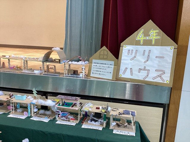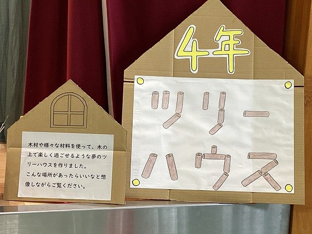 4年生のテーマは「ツリーハウス」。木の上で楽しく過ごせる場所を思い浮かべた作品です。木板を電動のこぎりで成形し、綿や松ぼっくり、葉っぱ、木の枝、毛糸、モール、リボン等を使い、個性あふれる楽しい作品になっています。