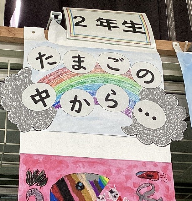 2年生は「たまごの中から」をテーマにした作品です。たまごの中からうさぎや魚、テスト、地球、夢の島、お花など、一人ひとりが自由な発想で、たまごから出てくるもの想像して描いています。子どもたちの想像力に圧倒される作品です。