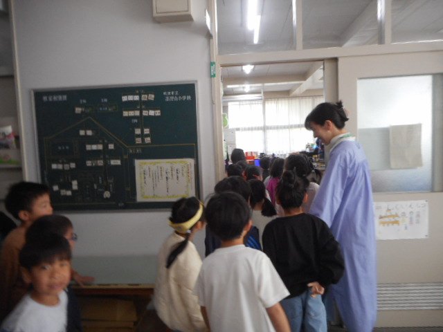 身体測定をしている学年がいたので、廊下からのぞきました。いろいろな検査もするお部屋なので、慣れてほしいです。体調が悪くなったリ、けがをしたりしたら、このお部屋に来てください。