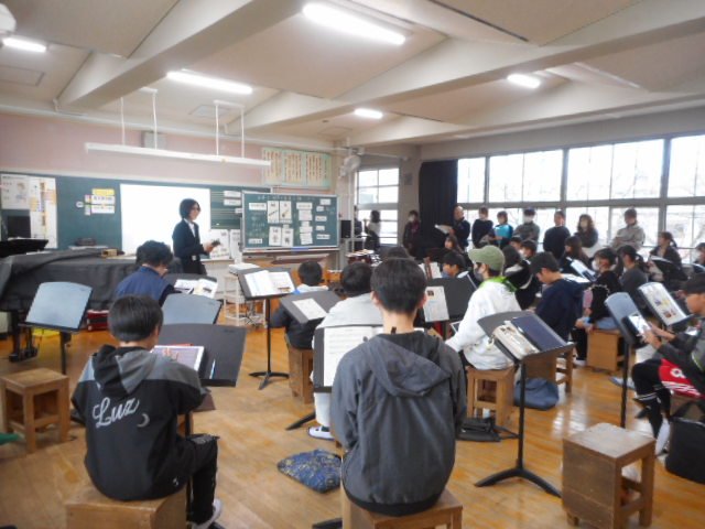 6年2組で音楽の研究授業を行いました。吹田市内の他校の先生方や本校の先生がたくさん参観されました。