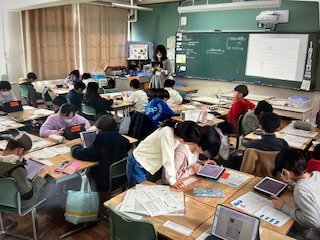 始業式後の教室では、端末を活用して「冬休み新聞」の交流を行っていました。