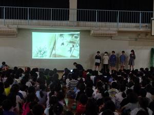 今朝は体育館で全校の児童が集まって、平和報告会を