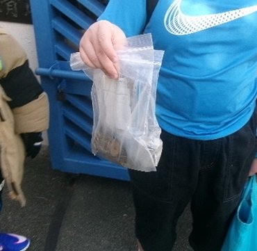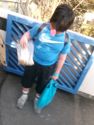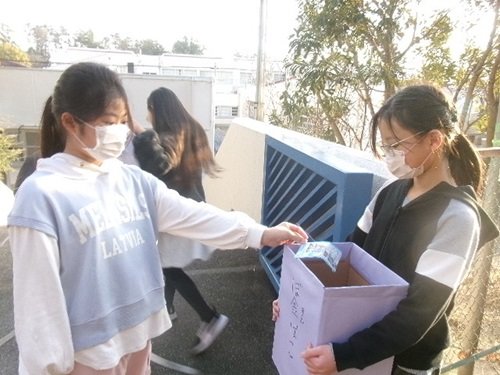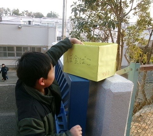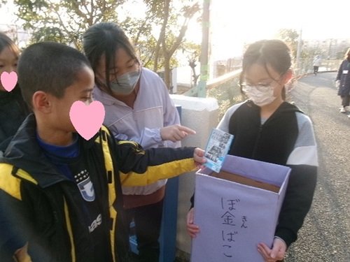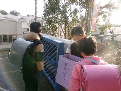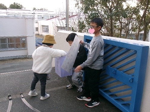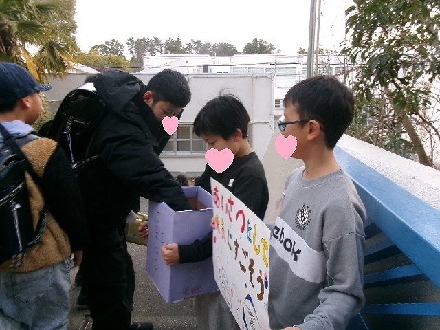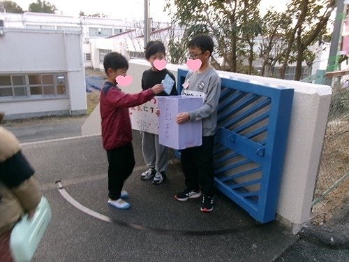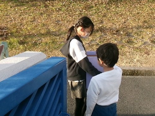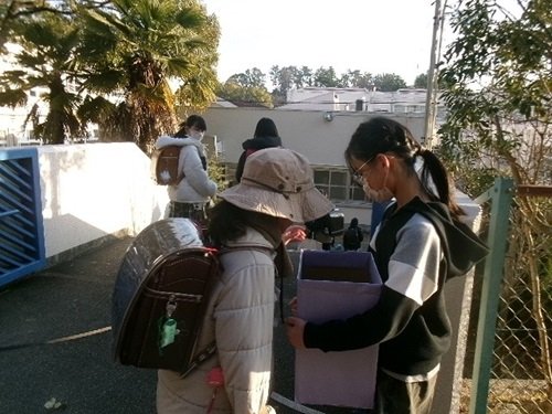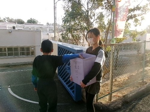 西門でちらかっている葉っぱを拾ってくれている3年生