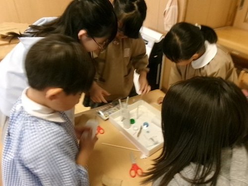 コリントゲームが完成したグループは、幼稚園内探検をしたり、