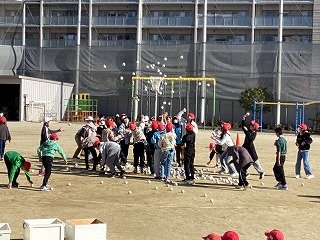 学期末のこの時期、どのクラスでも学習の締めくくりやテストが続きます。そして学習のめどがついたら特別活動の時間などを使って「お楽しみ会」をします。この日、運動場を覗くと児童らの大きな歓声が。季節外れの運動会?と思ったら6年生の「学年合同お楽しみ会」でした。この日は天気も良く、運動場でダンシング玉入れや綱引きをしていました。お楽しみ会はクラス単位ですることが多く、学年単位でお楽しみ会をするのは珍しいのですが、ノリのいい学年なのでみんな"真剣に"競技を楽しんでいました。5年生までの学年は来年度以降もありますが、6年生はあと3カ月でお別れ。こうして学年のみんなで思い出を紡いでいきます。
