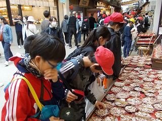 散策後はお待ちかねの買い物タイム。宮島表参道商店街は約350mあり、土産物や食べ歩きを楽しみました。揚げもみじまんじゅうやソフトクリームが人気で、もみじ饅頭や名前入りしゃもじ、ご当地キャラクターの小物もよく売れていました。楽しい時間はあっという間に過ぎ、昼食会場のホテルへ。カツカレーをいただき、再びフェリーで宮島口港へ戻り、バスで広島駅へ。疲れが出て爆睡する児童も多かったようです。