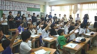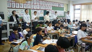 9月25日にJK公開授業をおこないました。「JK」といっても"女子高生"ではありません。大阪府教委が配置する加配のことで「授業改善」の頭文字をとって「JK」と呼んでいます。加配というのは特定の目的達成のために基準となっている教員配置数に加えて教員が配置される仕組みのことをいいます。本校に配置されている「授業改善加配」は児童の学力向上をめざして日々の授業の改善を提案したり、実践したりすることをその役割として日々活動しています。この日おこなったのは市内他校に配置されている学力向上のための加配教員と市教委の担当指導主事に授業を見てもらう「公開授業」でした。本校の教員も授業を参観し、授業後の協議会でも日々の授業改善について意見を交換し、内容の濃い時間を持てました。
