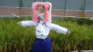 5年生が育てているプランターの田んぼにかかしが出現しました。今年は想像以上に暑い夏でしたが、稲たちは暑さに負けず順調に育ち、稲穂を実らせ始めています。このような稲を狙っているのが鳥たちで、ネットはしているものの、収穫前に食べられてしまうことも多々あります。そこで登場したのが「かかし」。5年生児童が一生懸命に作りました。近づいてみると怖い顔ではなくどことなく愛嬌のある表情をしています。かかしさん、鳥たちを追っ払ってくださいね。