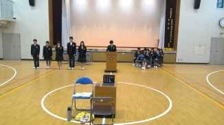 前期生徒会のみなさんが、退任の挨拶を行った後、後期生徒会の委嘱式、生徒総会を行いました。