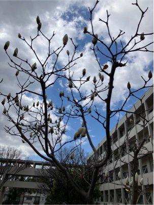 中庭のハクモクレンのつぼみが膨らんできました