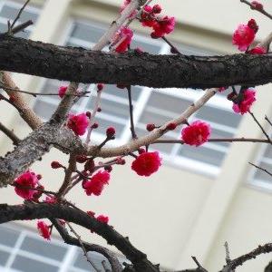 中庭の梅の木が、寒さの中で凛とした美しい花を咲かせています。