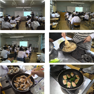 2年生の家庭科では、調理実習が行われ、ひき肉を使った料理を班ごとにメニューを考えて、作っていました。餃子にスタミナ炒め、キーマカレーなどいいにおいが漂っていました。