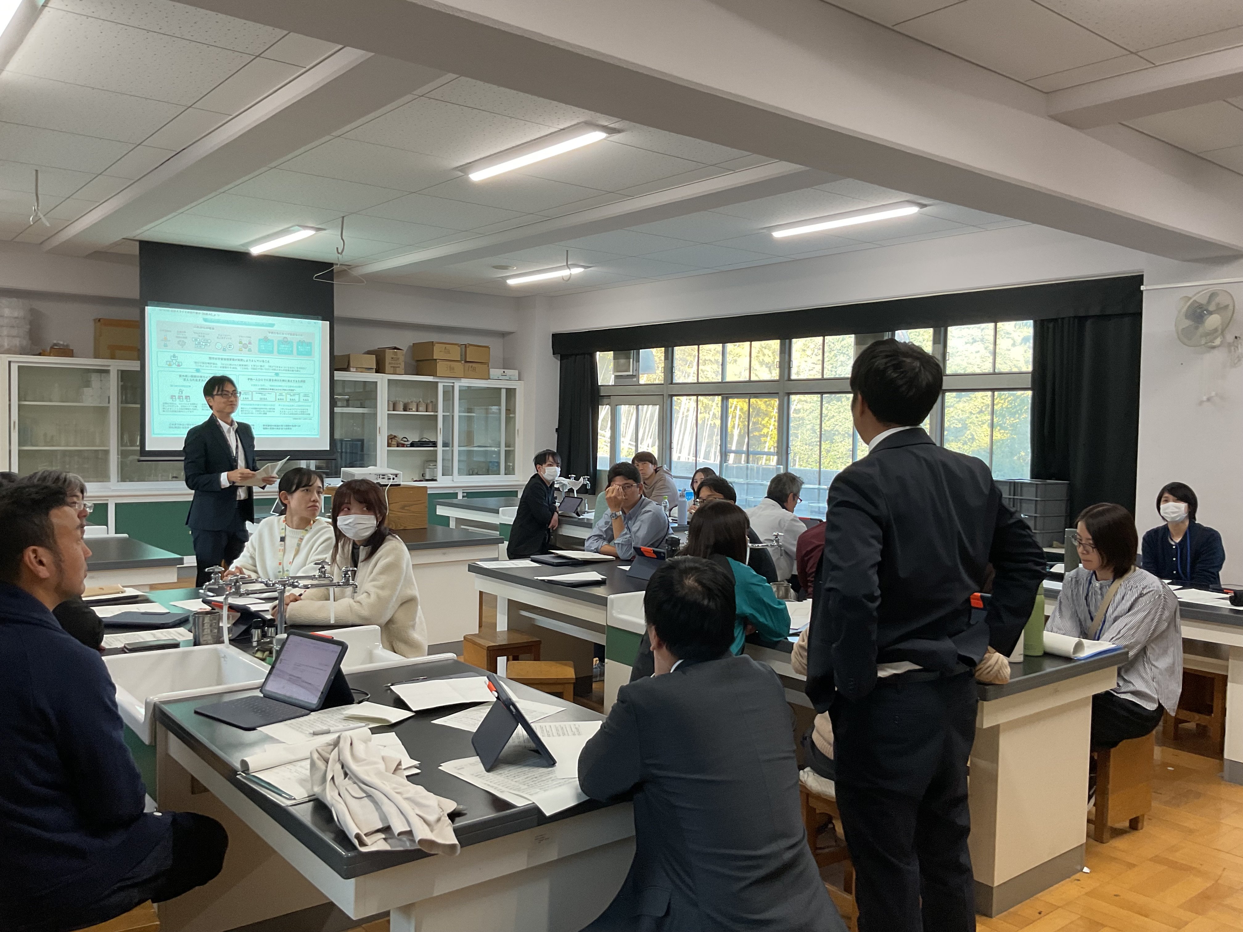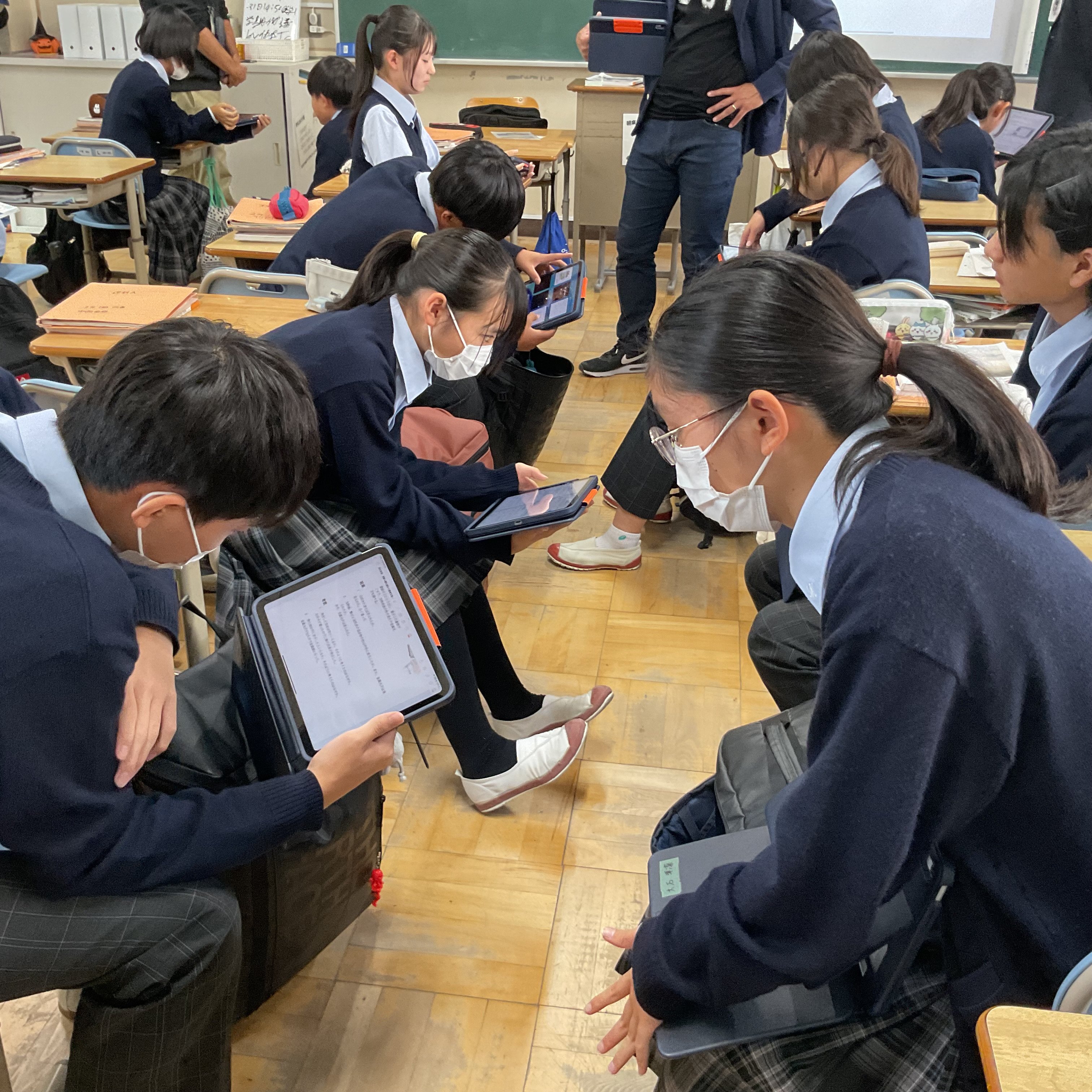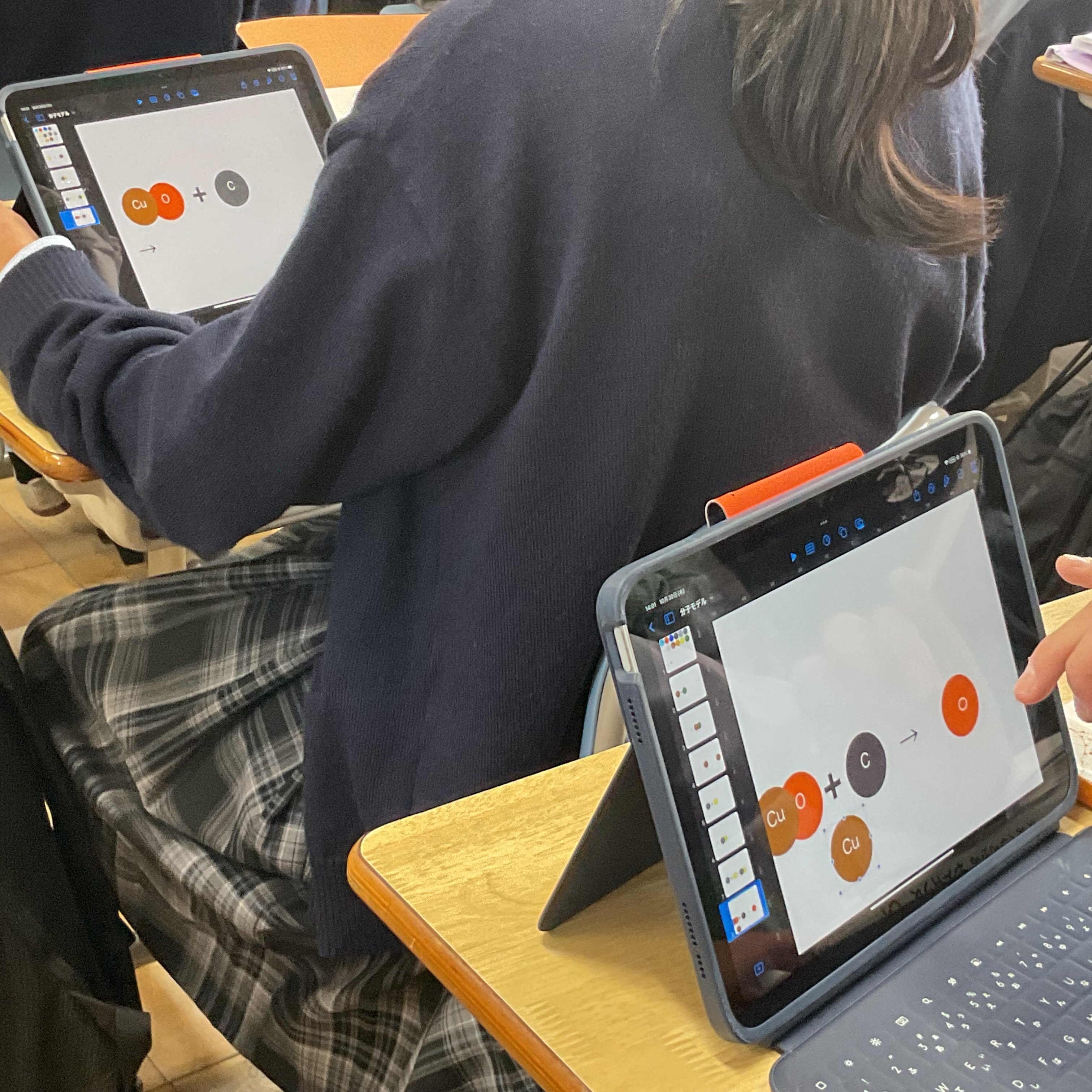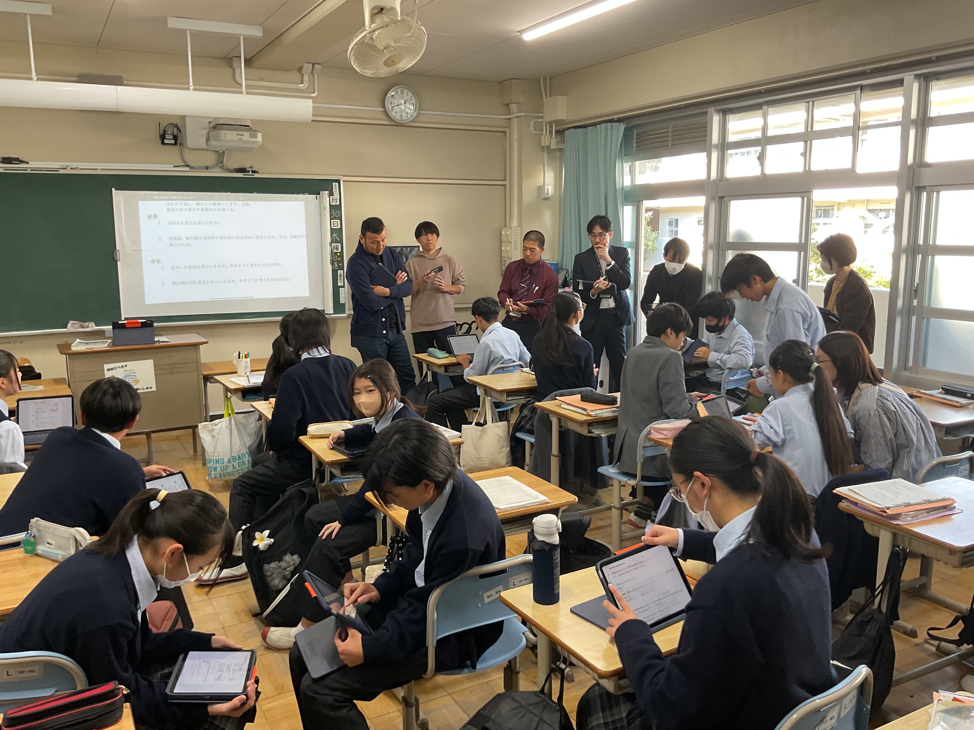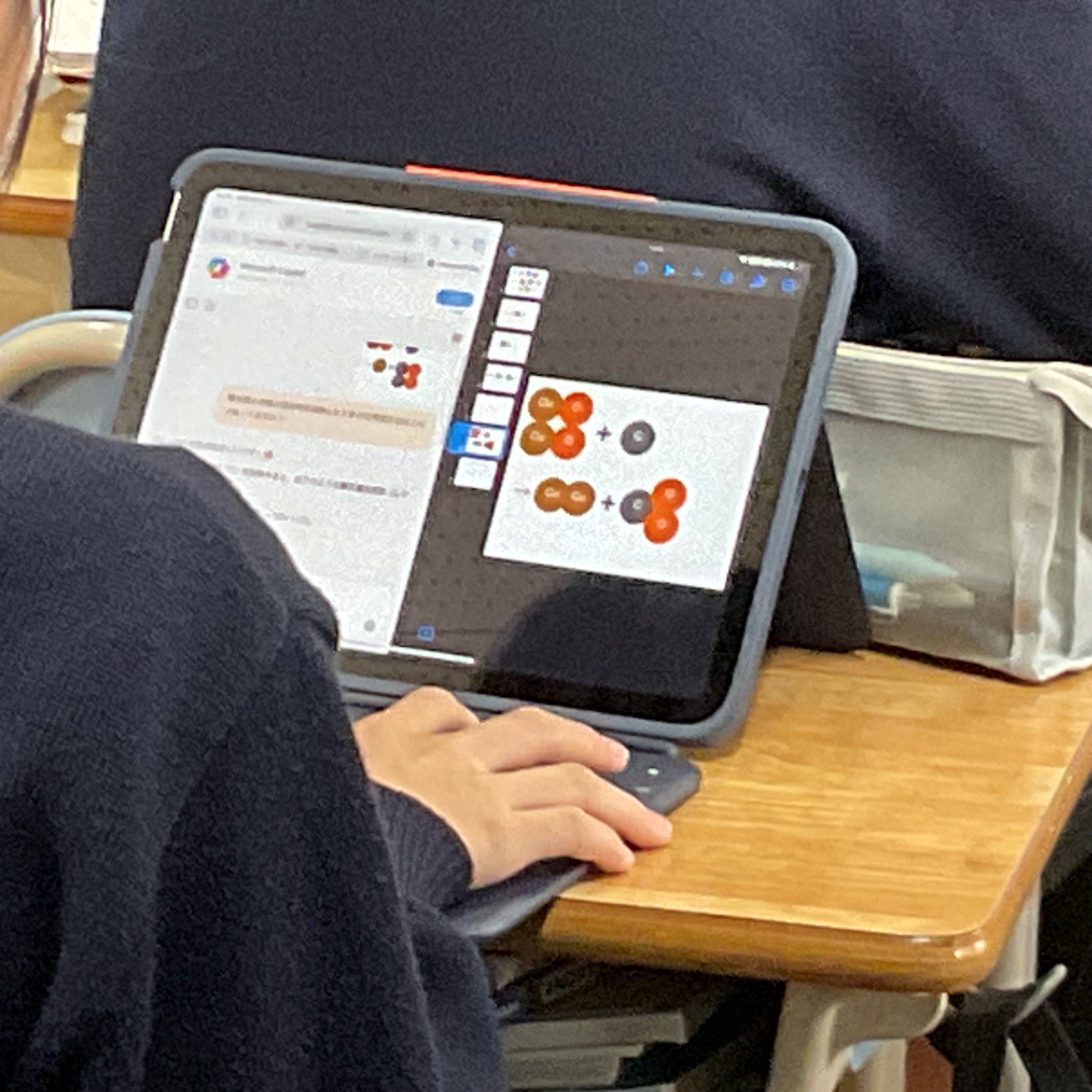 2年生理科、酸化銅の還元について、実験結果を振り返りながら化学反応式、分子モデルについて考え、説明することをねらいとしました。思考の時間は個別に端末と向き合い、画面上に式を描いたり、分子モデルを図示しながら、集中して進めていました。方法は自ら選択し、生成AIへ尋ねたり、確かめたりしながら自分の考えと行きつ戻りつしながら、結論を導いていました。基礎基本は既習のプリントに戻る場面もありました。今回は校内研究授業として、生成AIの授業活用をモデル実施することも教師側のねらいでもありましたので、提示された回答を丸呑みせず、確かめながら使用することも踏まえつつ、情報モラルの押さえも明示されました。今回の研究授業で本校において、またひとつハードルを超えた実践となりました。