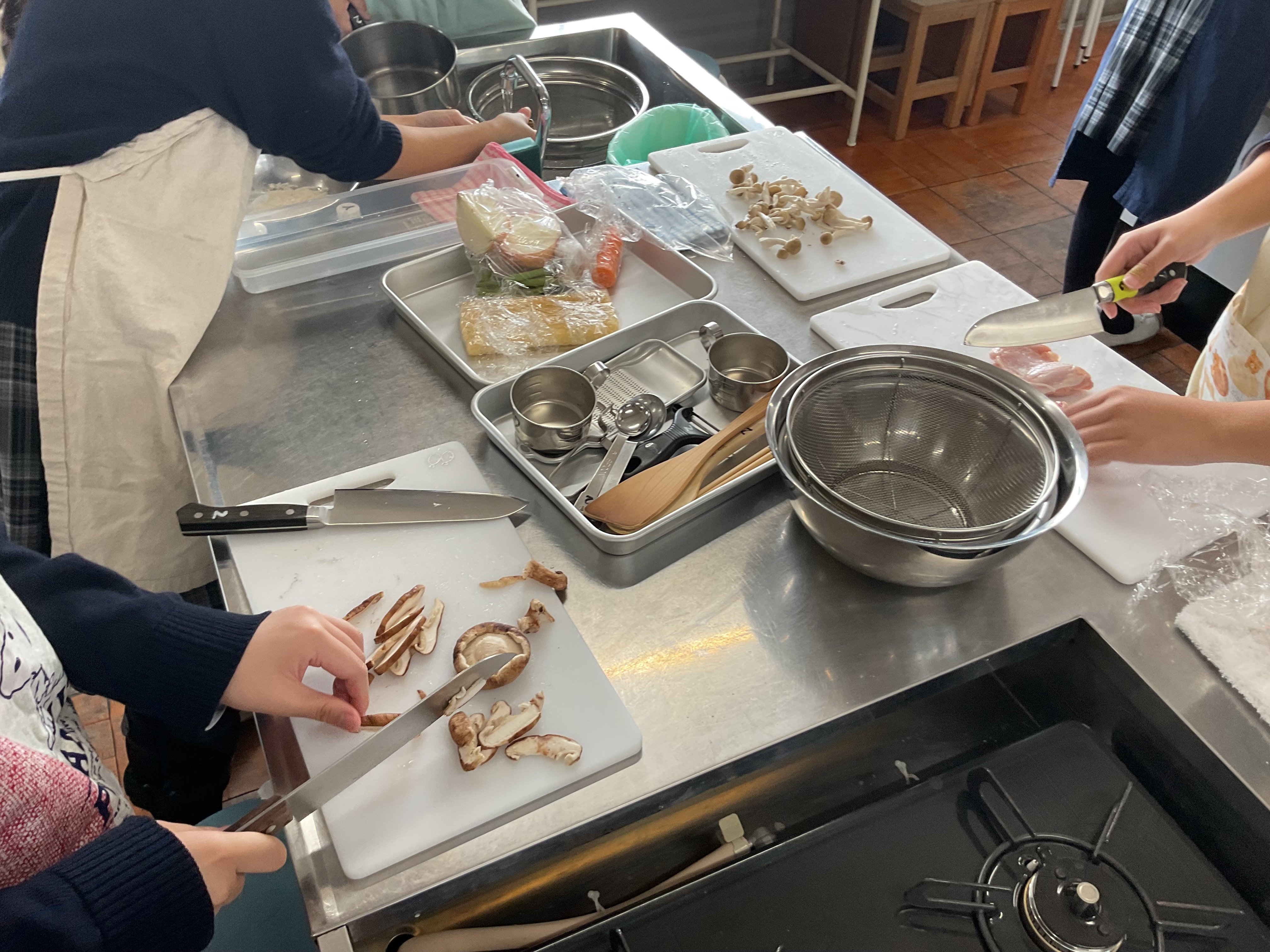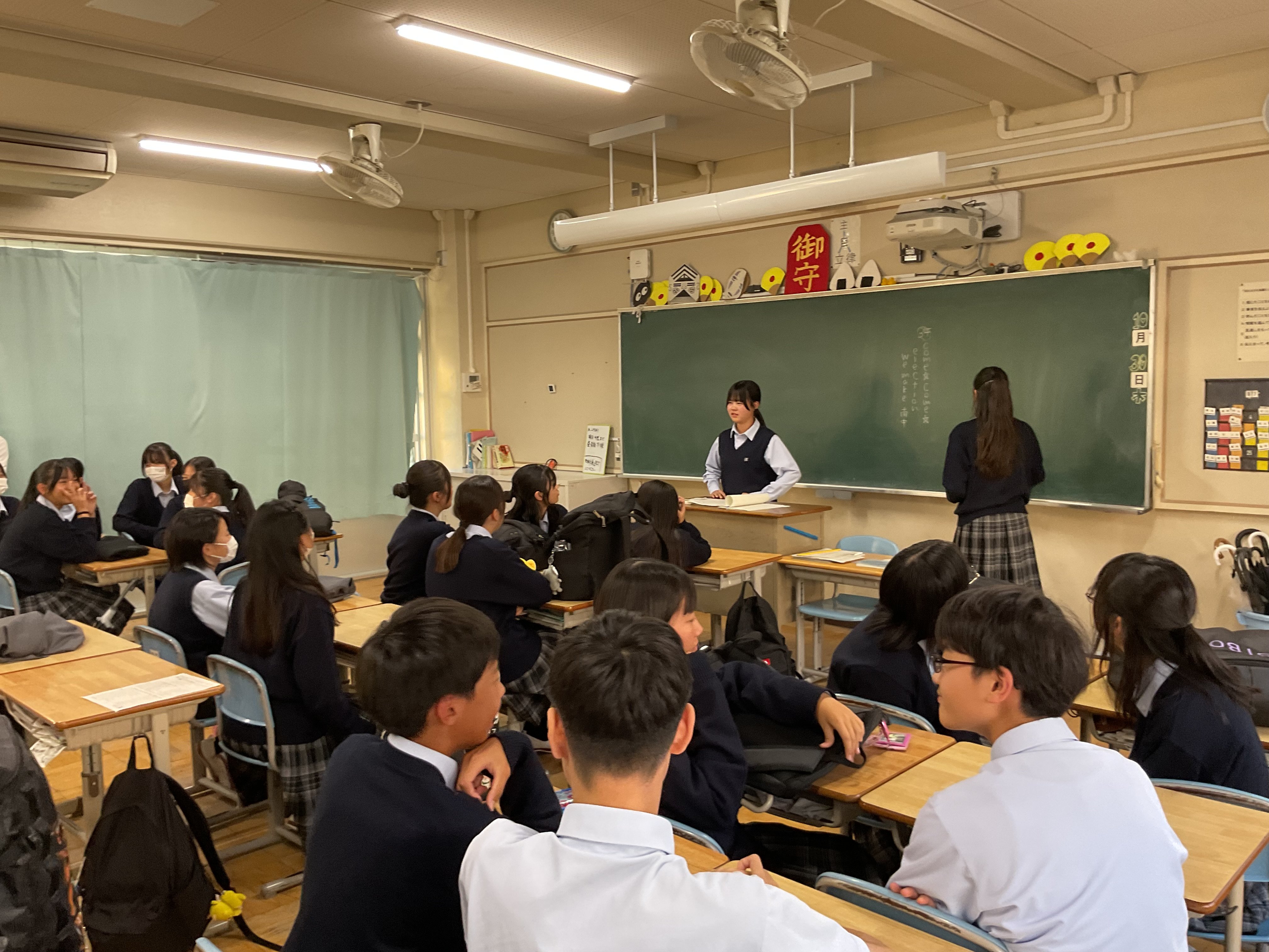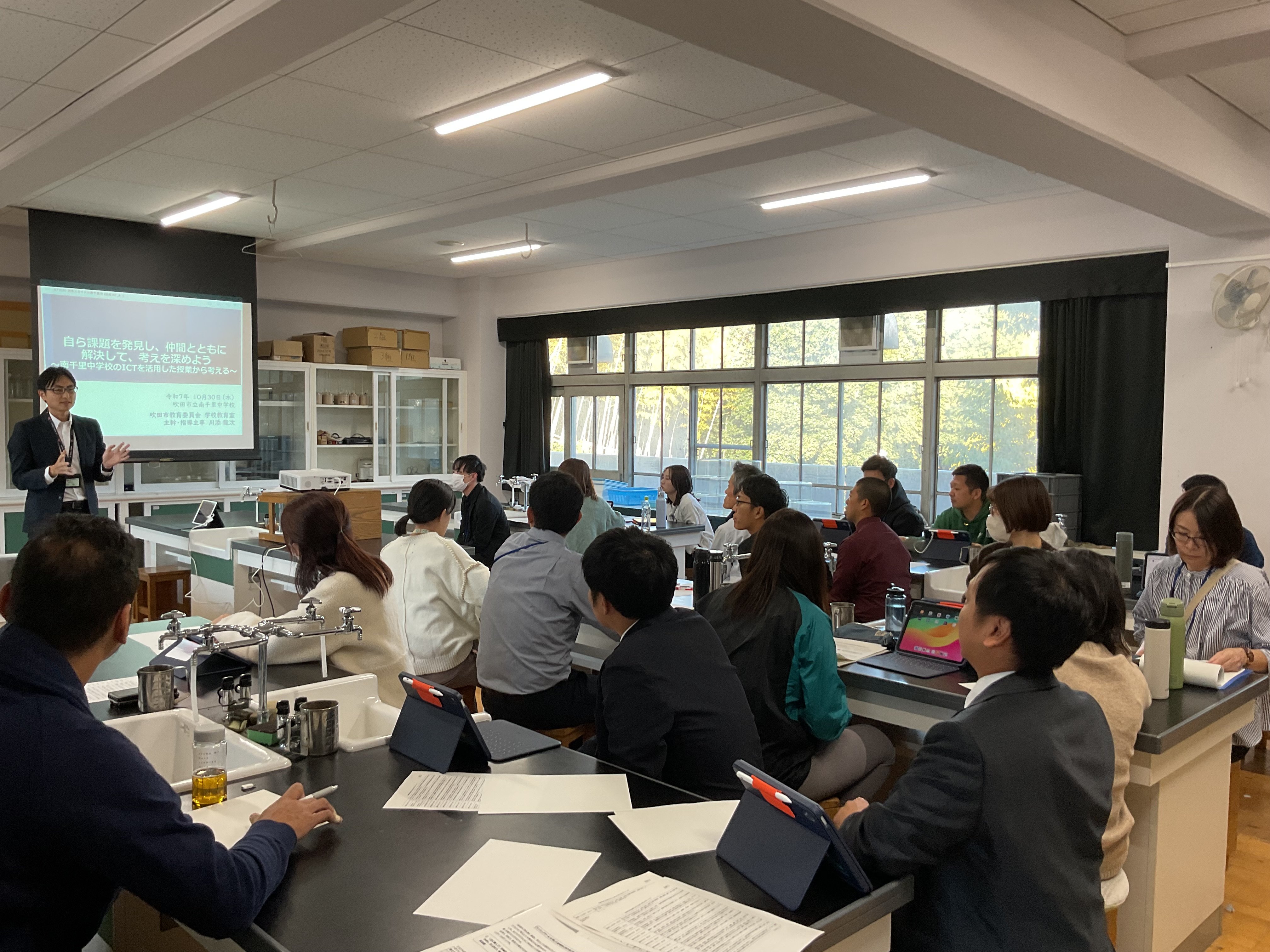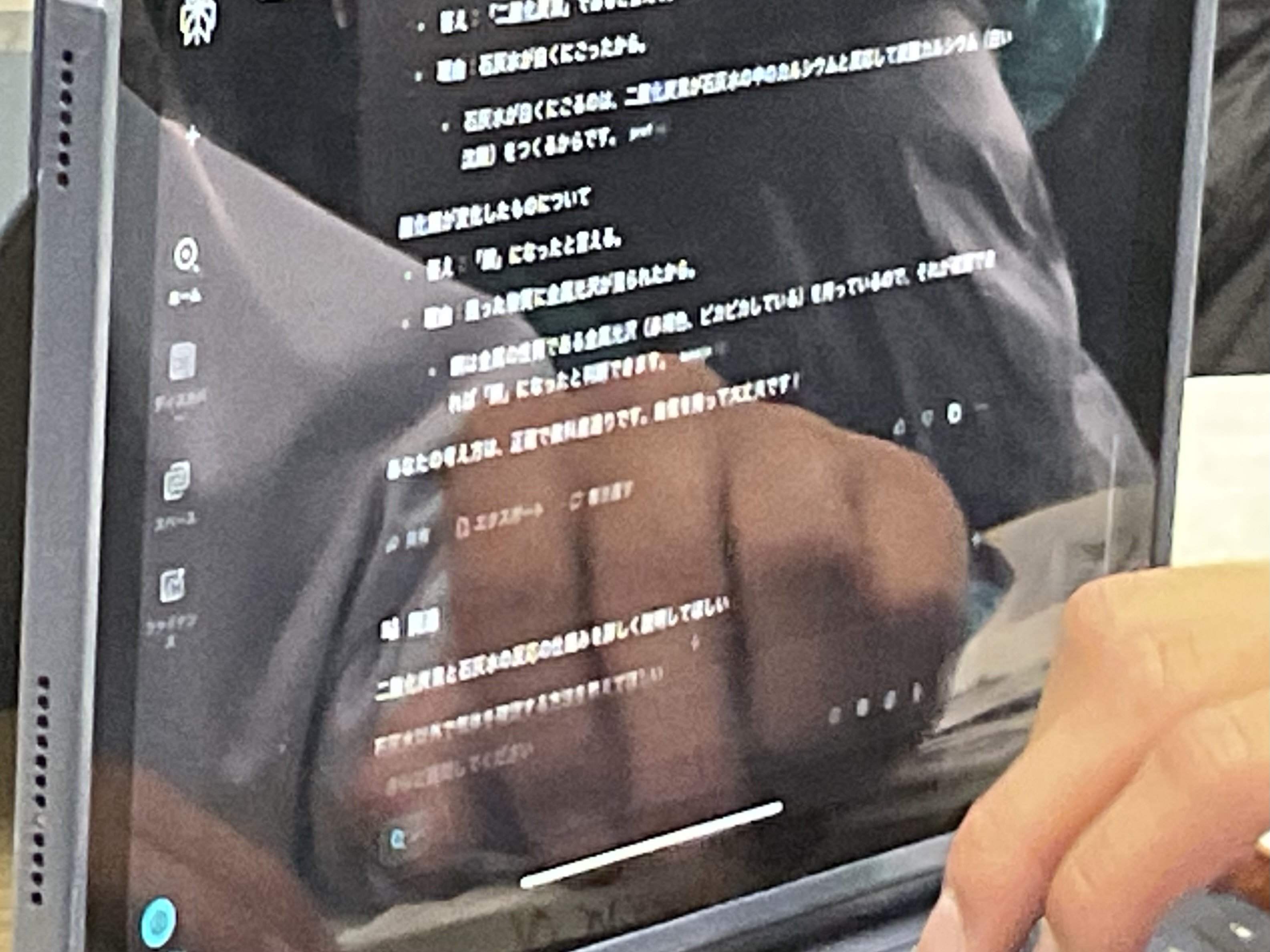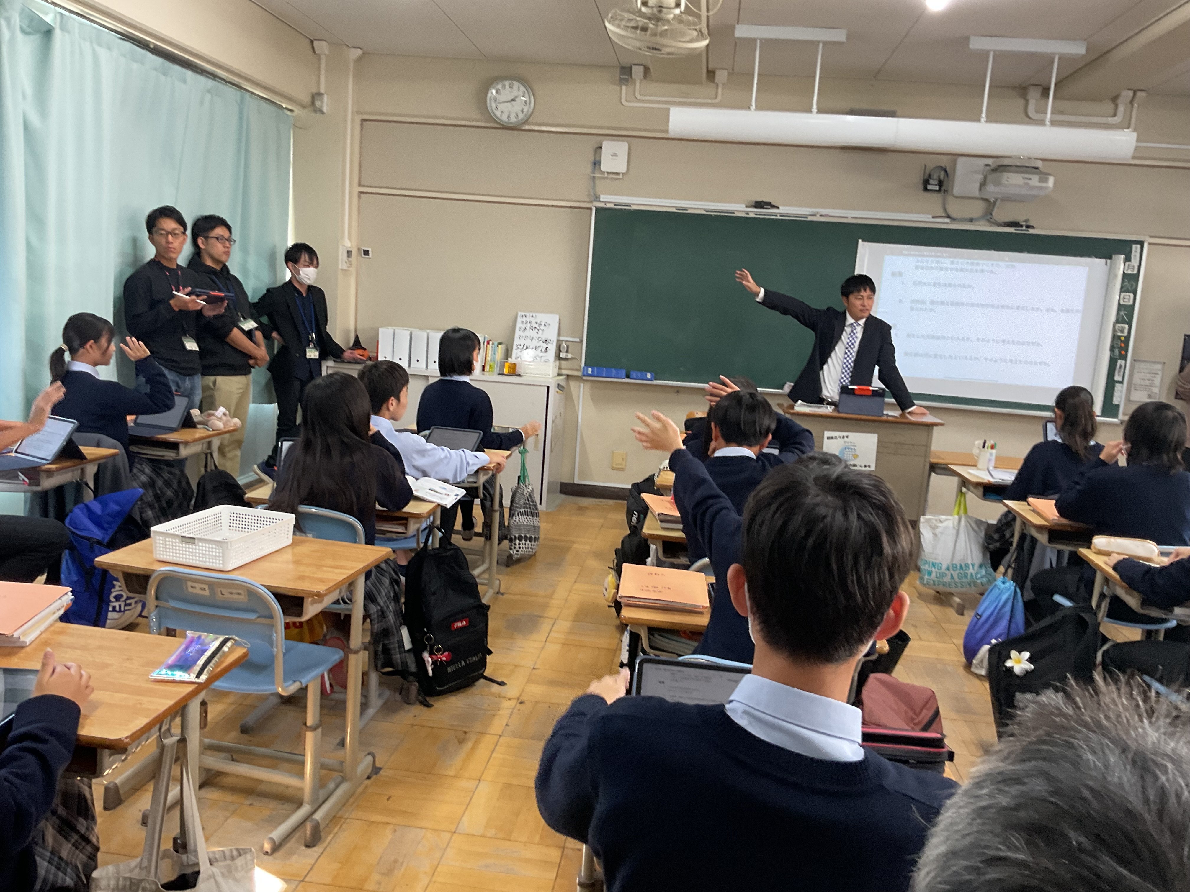 2年生理科、酸化銅の還元について、実験結果を振り返りながら化学反応式、分子モデルについて考え、説明することをねらいとしました。思考の時間は個別に端末と向き合い、画面上に式を描いたり、分子モデルを図示しながら、集中して進めていました。方法は自ら選択し、生成AIへ尋ねたり、確かめたりしながら自分の考えと行きつ戻りつしながら、結論を導いていました。基礎基本は既習のプリントに戻る場面もありました。今回は校内研究授業として、生成AIの授業活用をモデル実施することも教師側のねらいでもありましたので、提示された回答を丸呑みせず、確かめながら使用することも踏まえつつ、情報モラルの押さえも明示されました。今回の研究授業で本校において、またひとつハードルを超えた実践となりました。