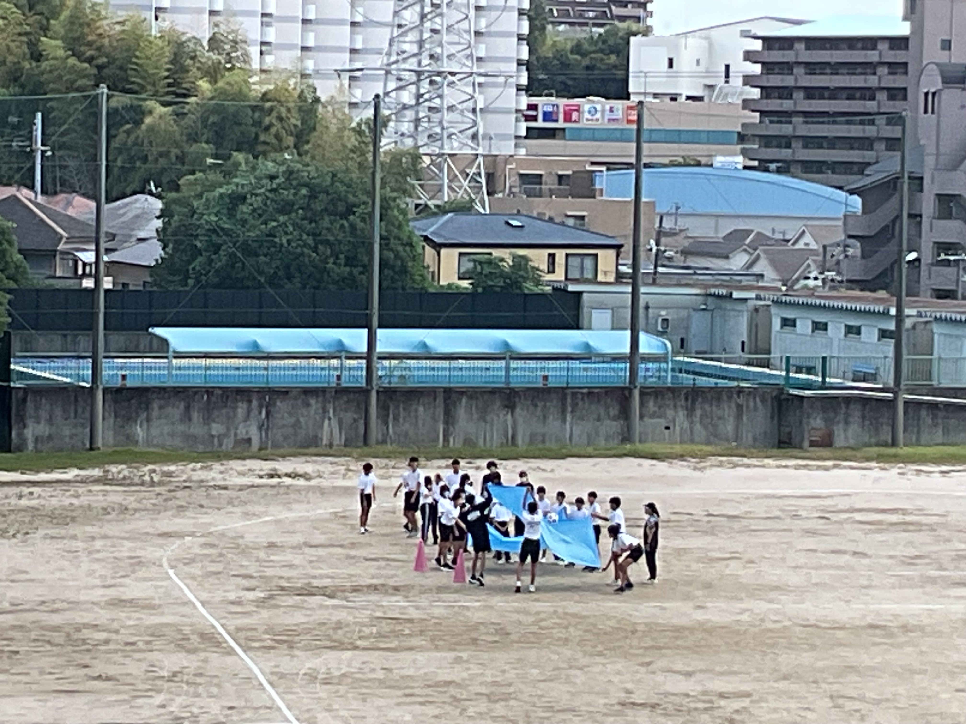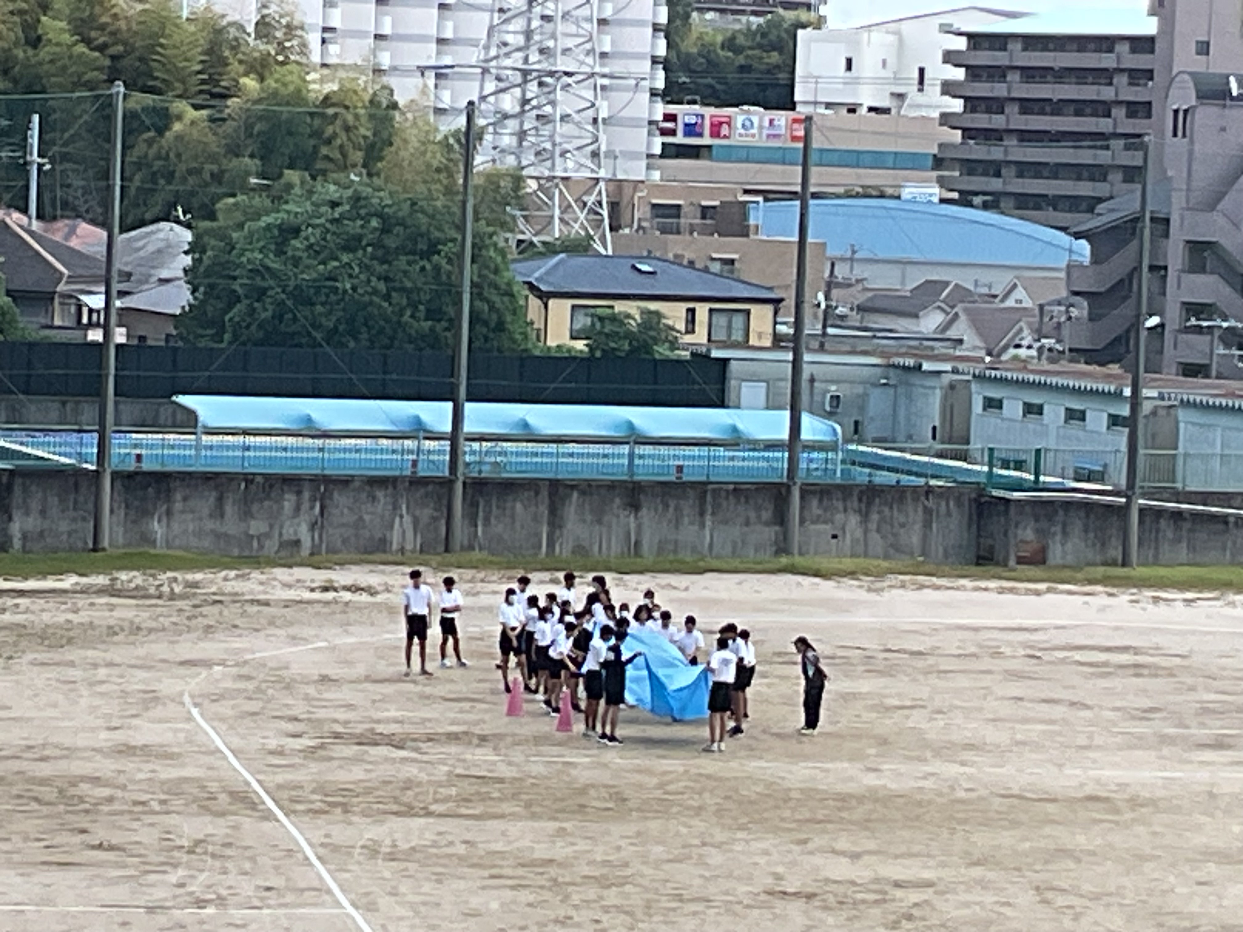 運動場、2年体育では体育大会で実施する学年種目を試行錯誤する姿がありました。ボール運びレースですが、ビニルシートをどのように操作するのか???3年理科では力の合成の単元導入として、綱引きをテーマに問いが投げられていました。各クラス勝負がかかっているので、興味深いですね!理科的な思考ののちにいかに実践に繋げられるのか・・・?