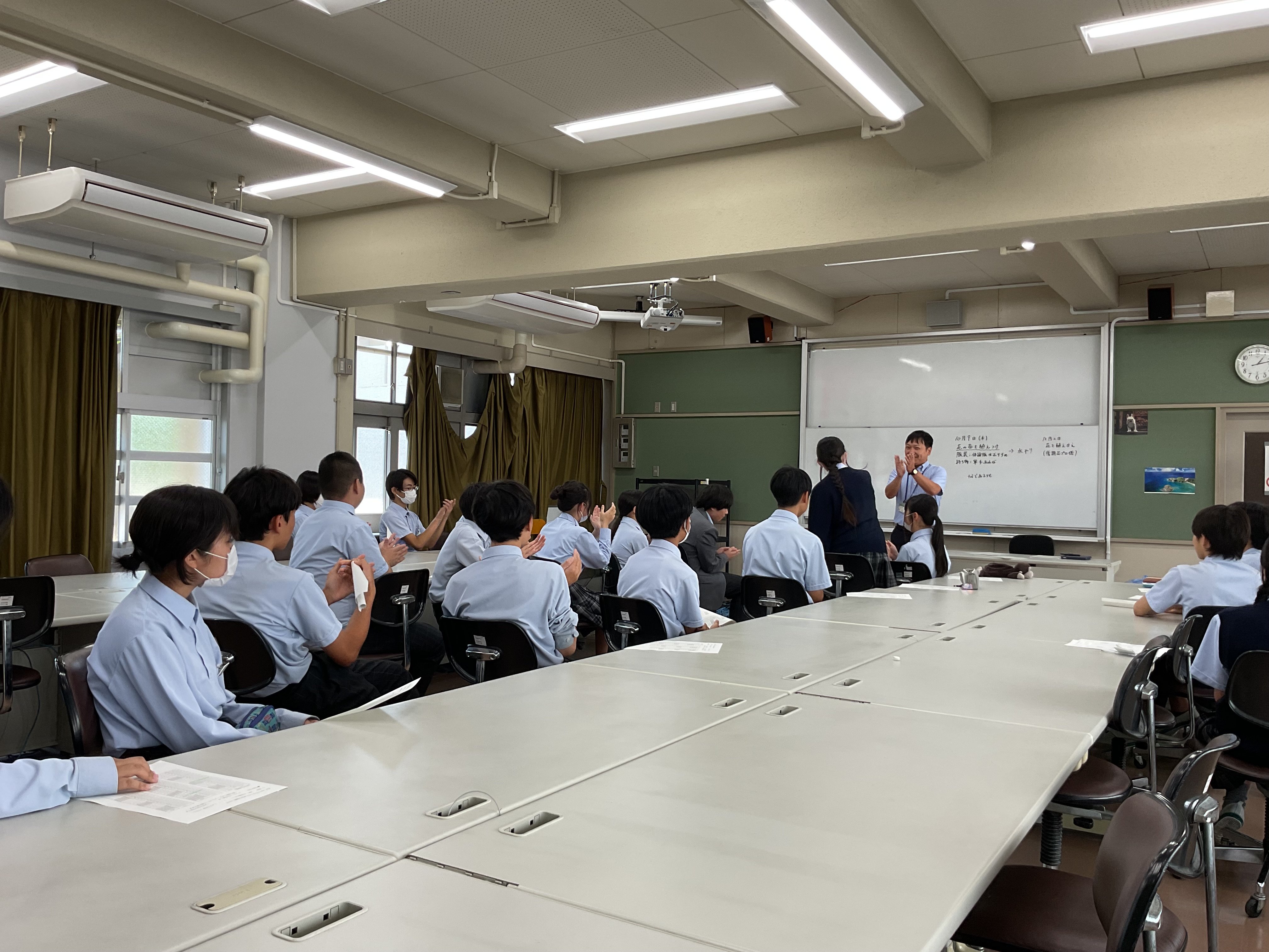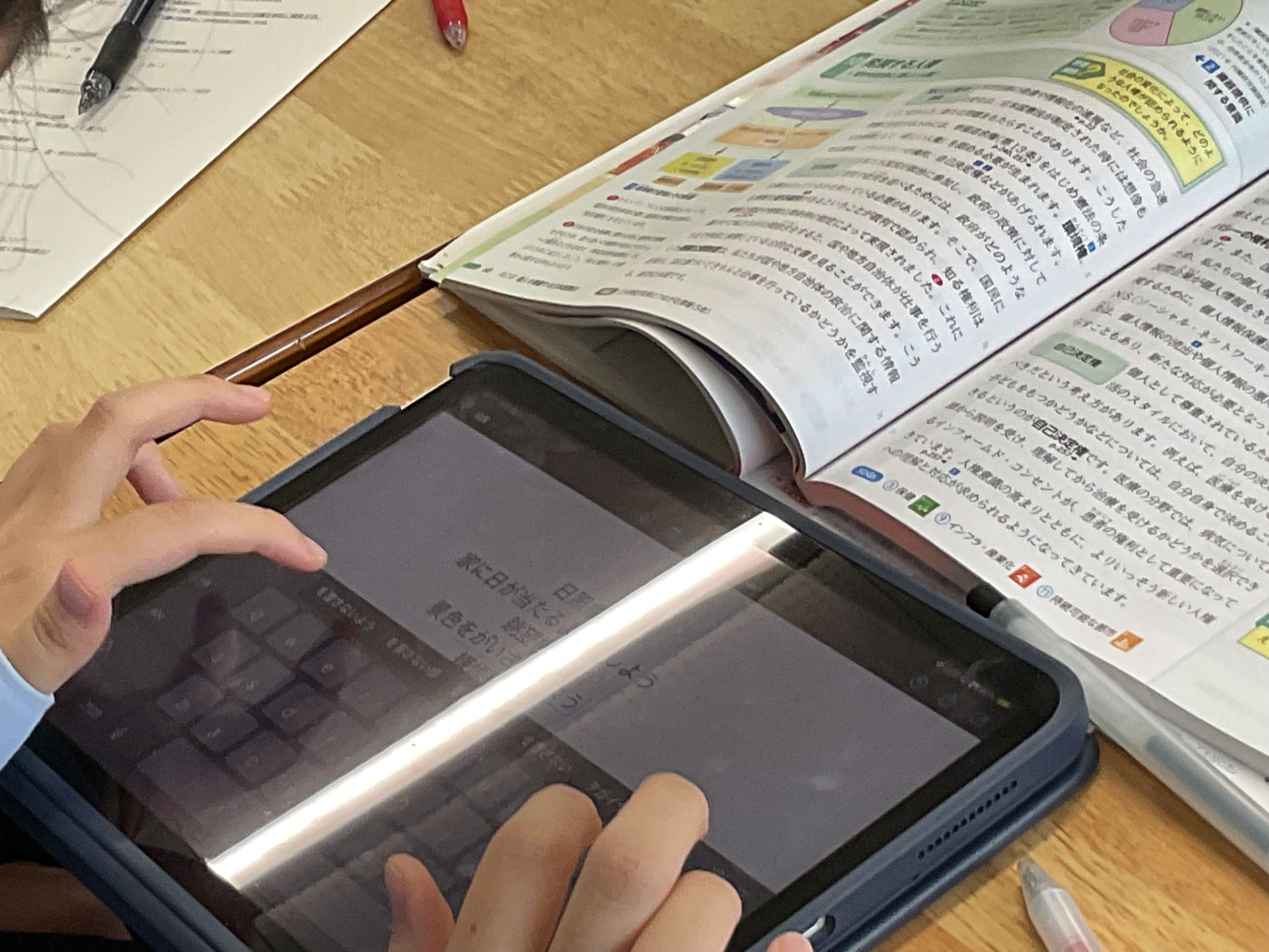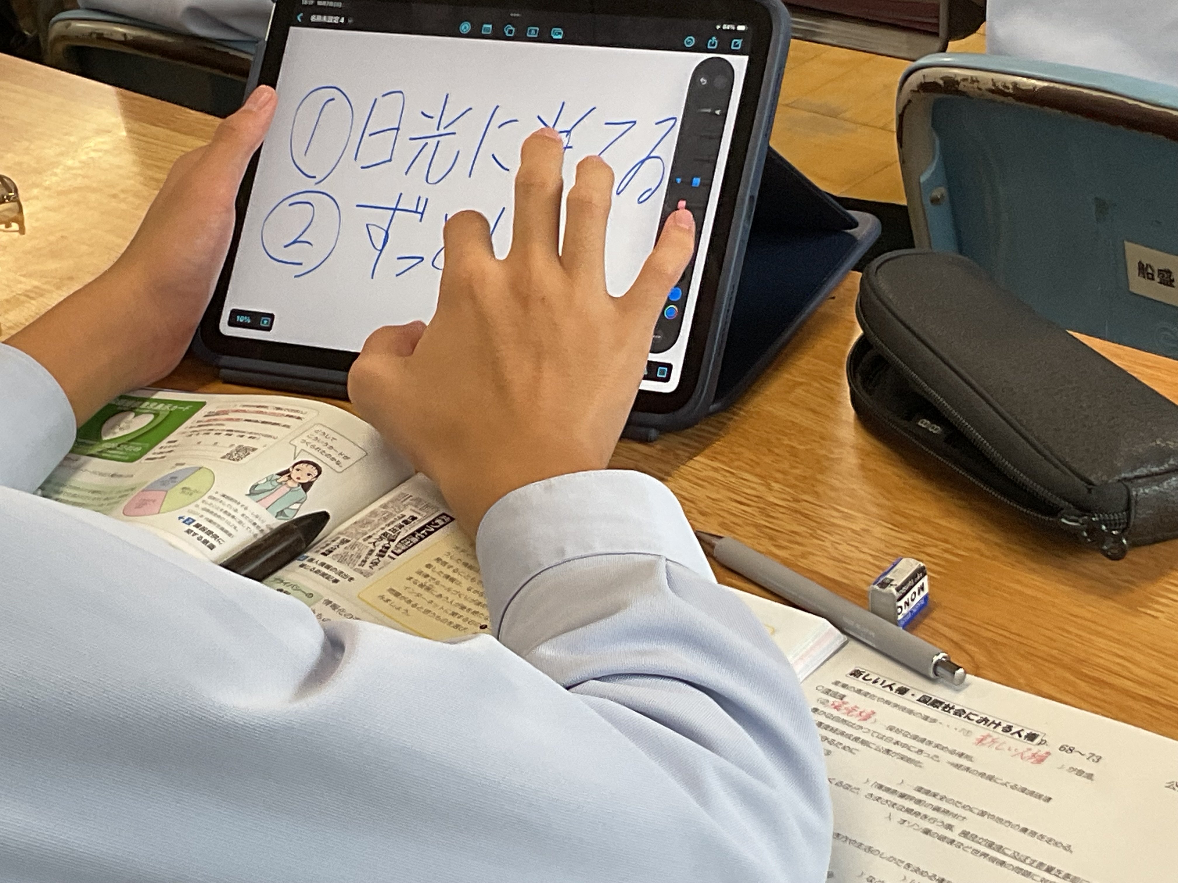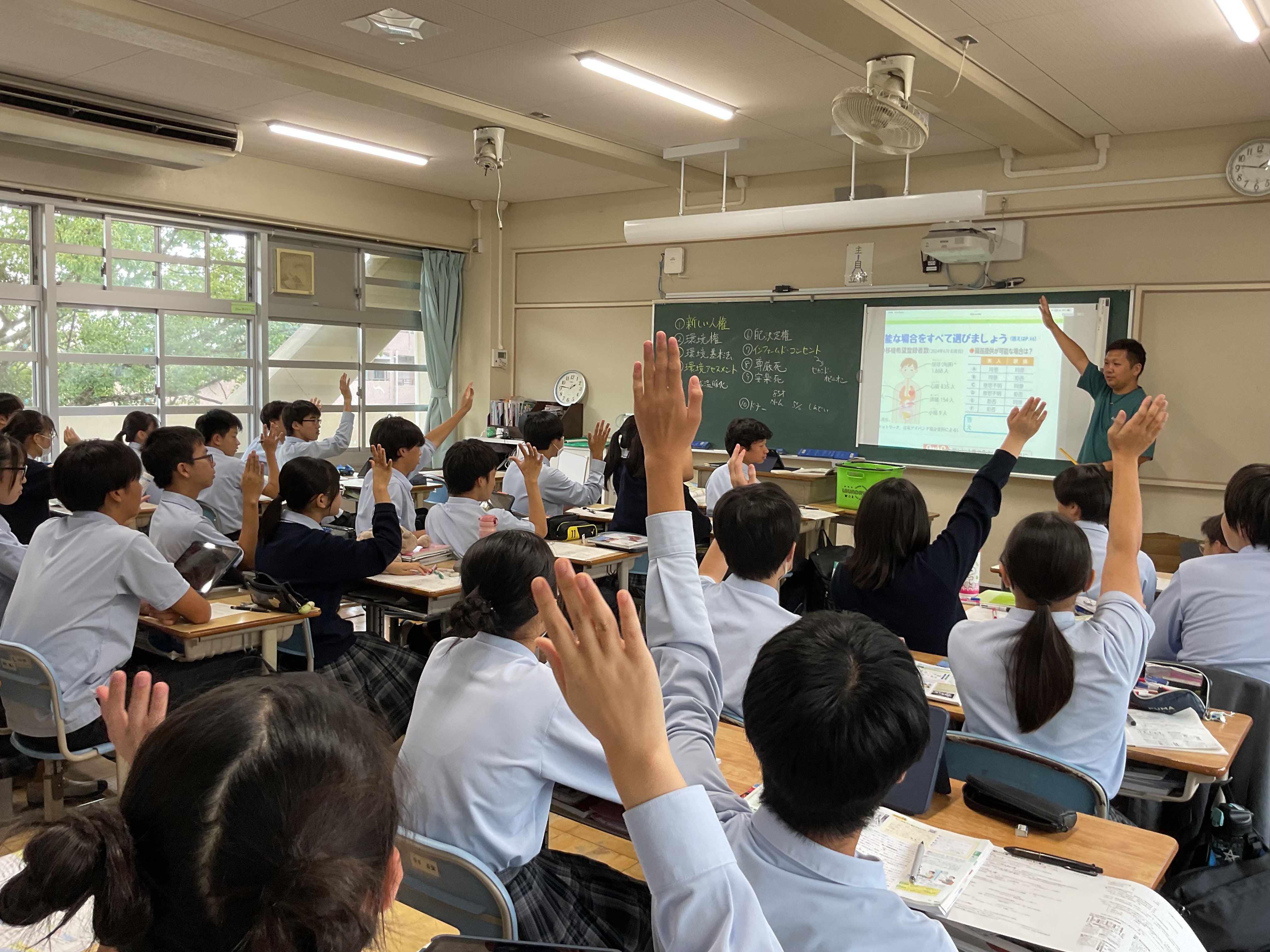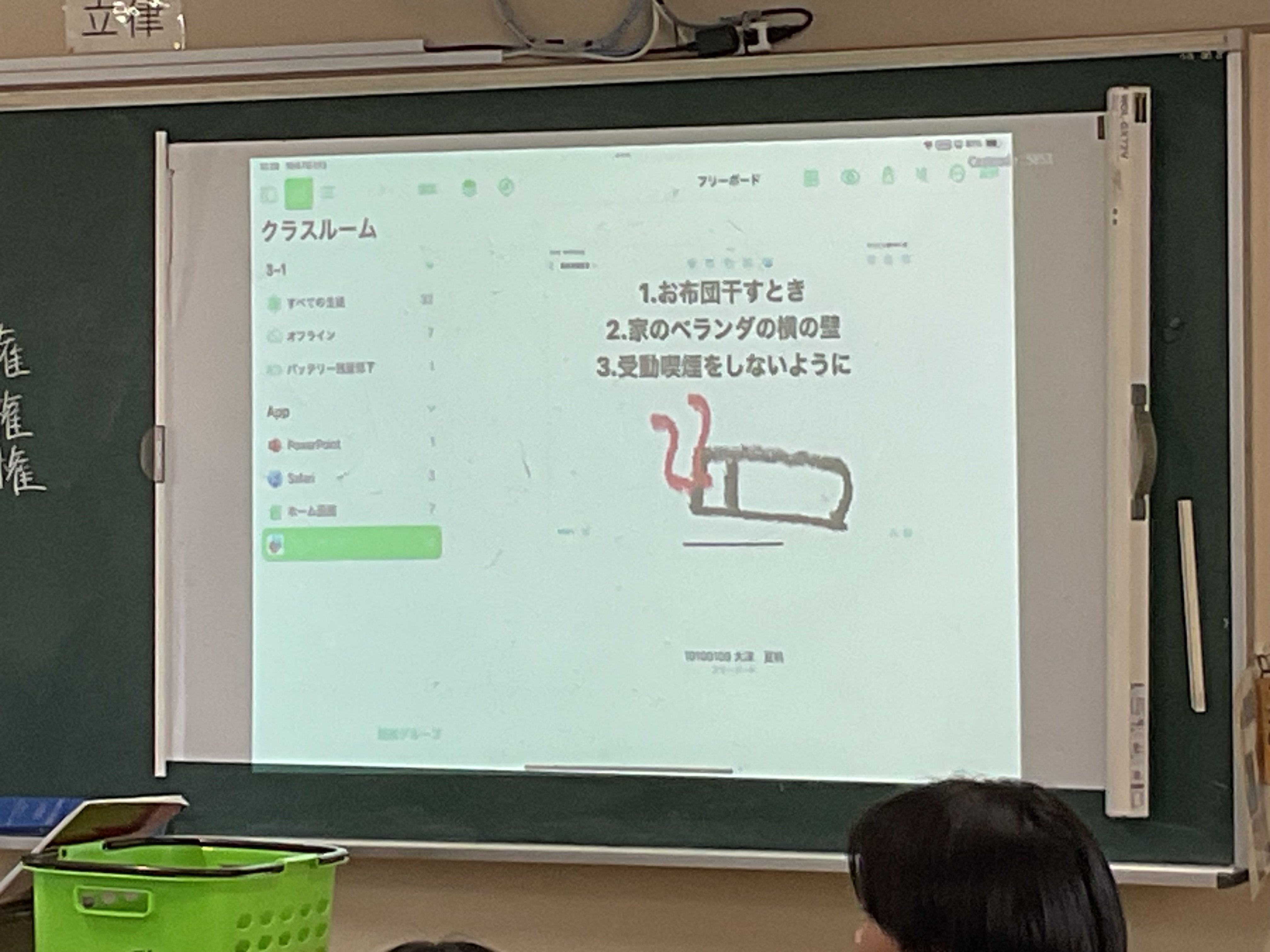 新しい人権についての単元です。環境権等について学びました。春から導入しているiPadをペアでの思考をフリーボードへ書き込み、クラス内で共有できる仕組みを1時間に複数盛り込み、相互の考えを知ったり、共有することで、テーマについての興味・関心を持つことができる展開でした。個別のノート記入や挙手→発言のみではできない、全体を巻き込める授業づくりが見られました。学校全体iPadの有効活用を試行中です。