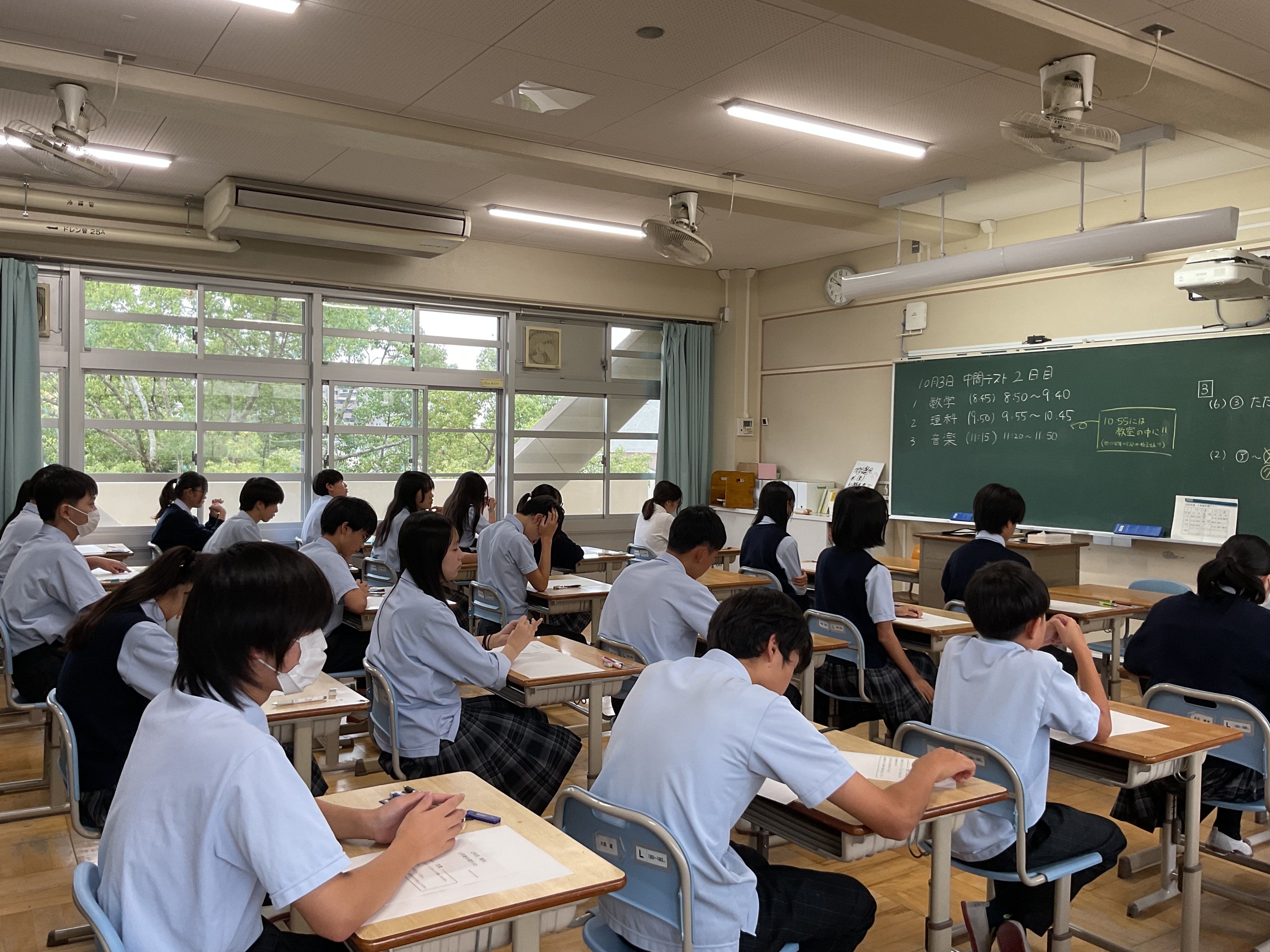 2週間前に総合文化発表会を終え、2週間後には体育大会を控える中、中間テストを本日、明日の2日間実施します。本日、3年生は5教科ですが、1年生は3教科、2年生は4教科と密度の濃いテストとなっています。登校中にも教科書や問題集を片手に歩いてくる姿が見られました。明日1日も集中して頑張りましょう。画像は3年生教室、英語のヒアリング問題配信の様子です。