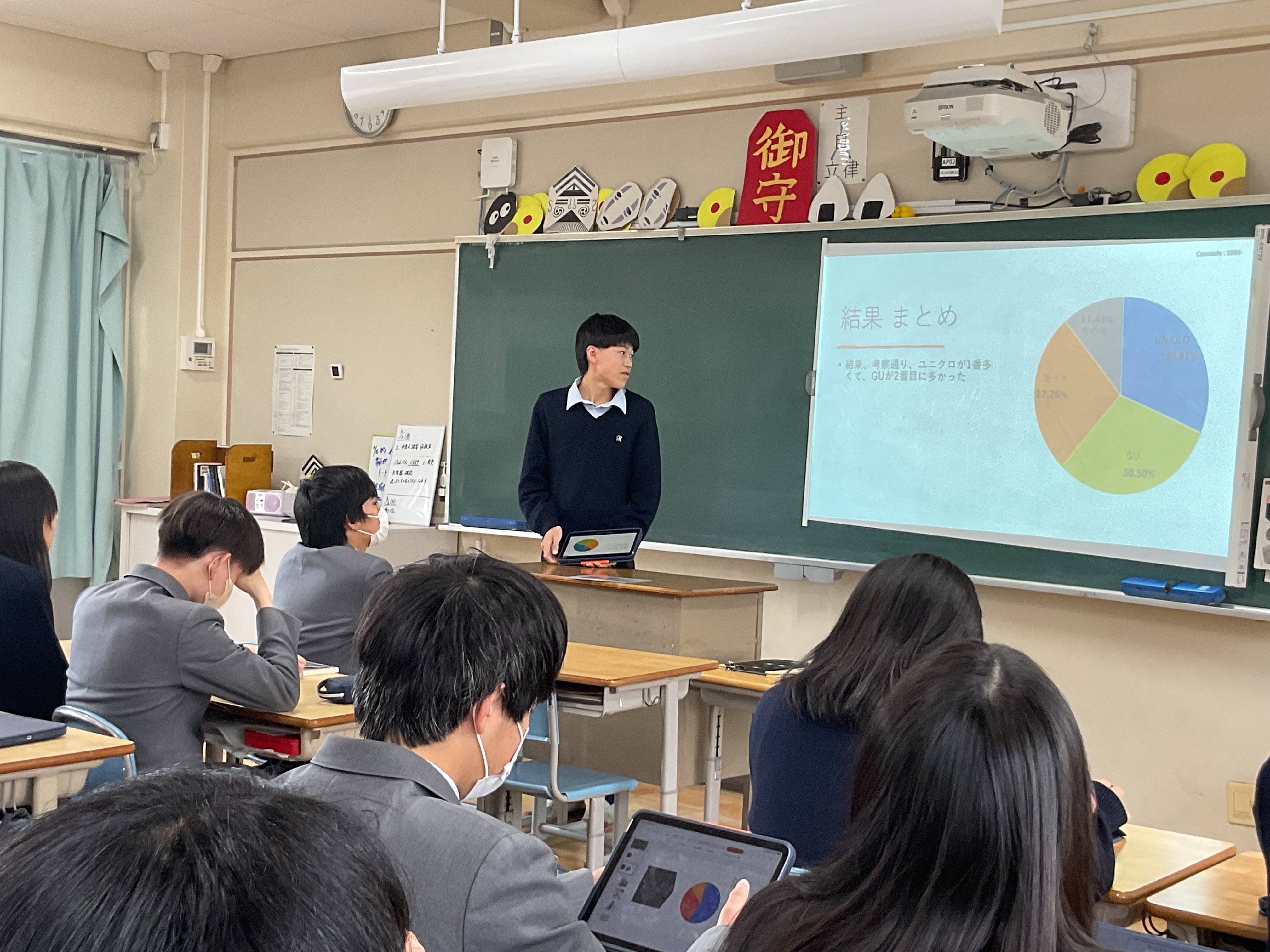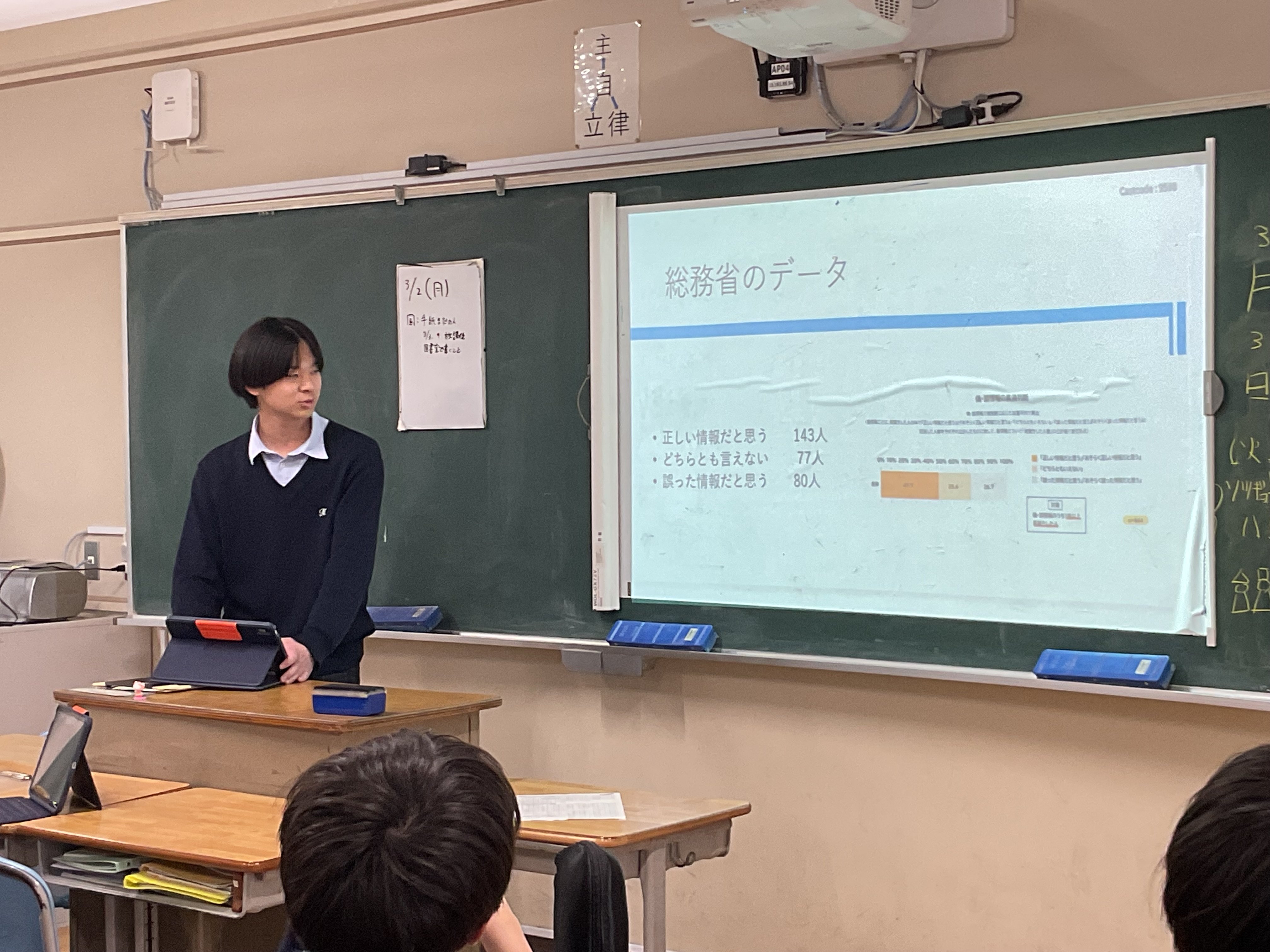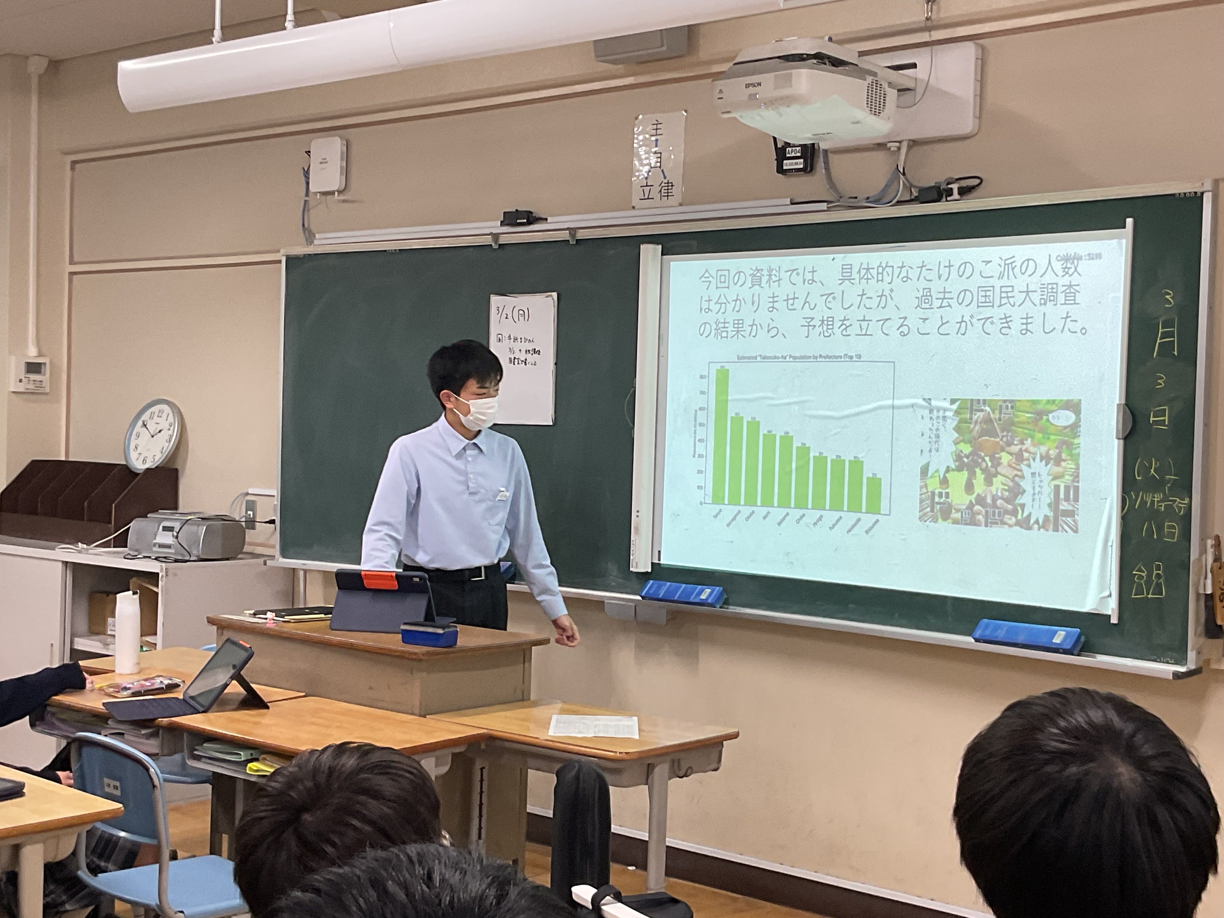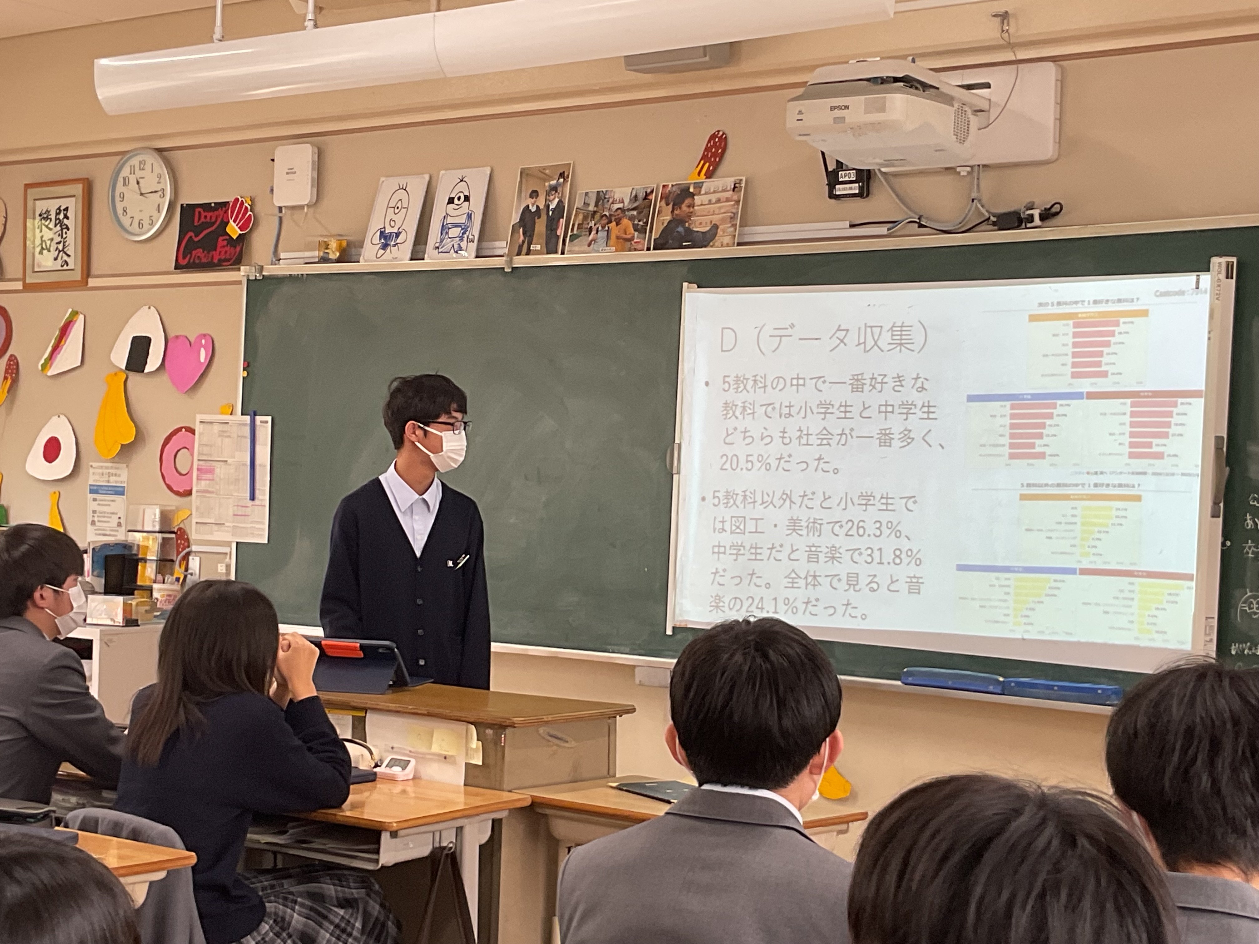最後の"統計"の単元です。興味ある課題について、データを収集し、分析、考察し、3分間のプレゼンテーションでクラス内共有を行う、ミニ探究を行いました。2回に分けて、全員が発表します。テーマは様々。本校3年生100名ほどに端末でアンケートを行った結果から考察する、国のデータで考察する、など手法も様々です。3年生の睡眠時間、塾、お菓子もあれば、株の動きとディズニーランドの集客数推移、高市政権の影響、校区近くの交通事故についてなど多岐にわたるテーマを取り上げ、語っていました。驚くことに、昨年吹田警察へ要望書をあげて、警察によるパトロールを強化したことで、事故が減っている、との報告もありました。行く末は市政に関わる???頼もしい限りです。