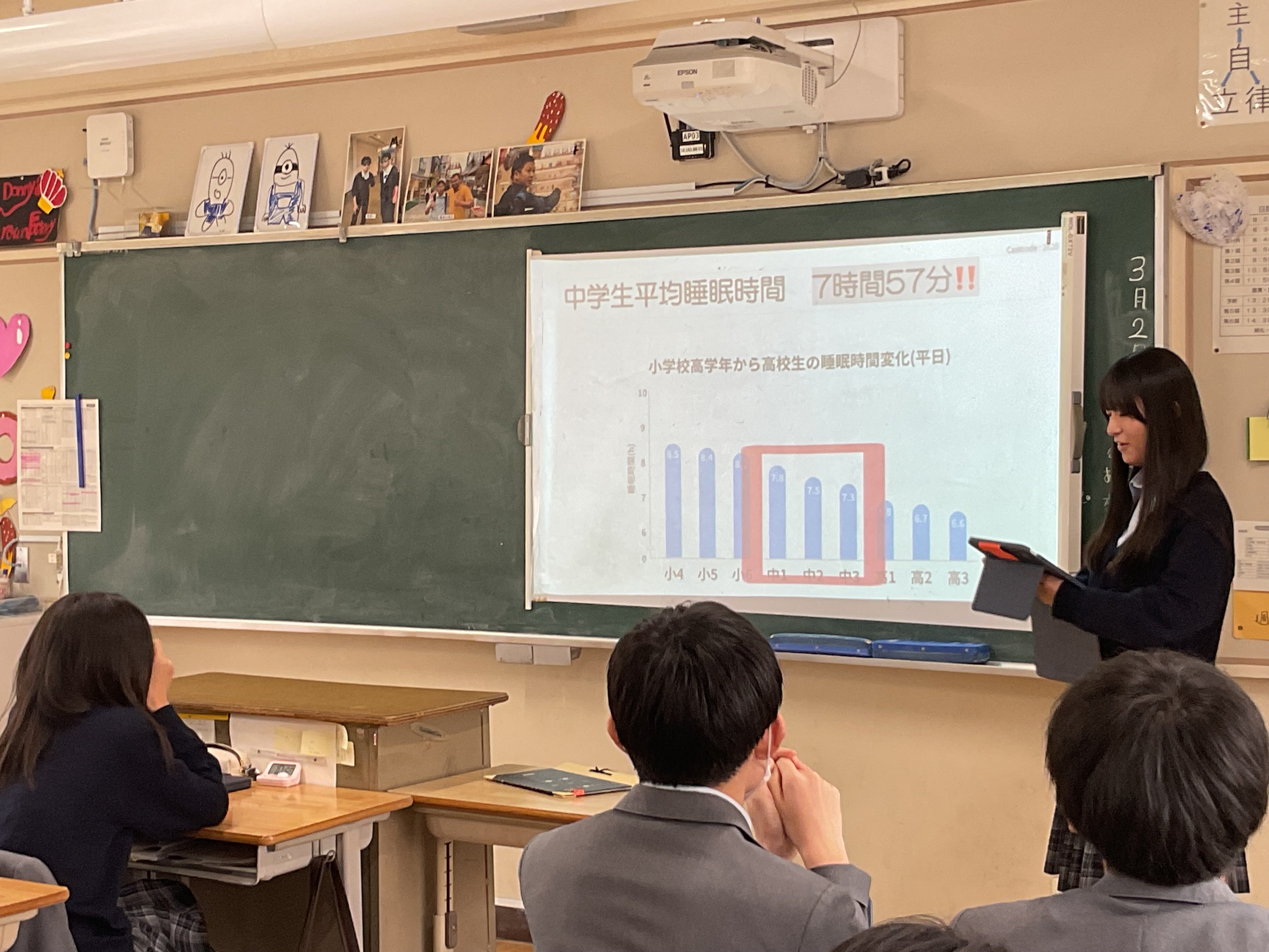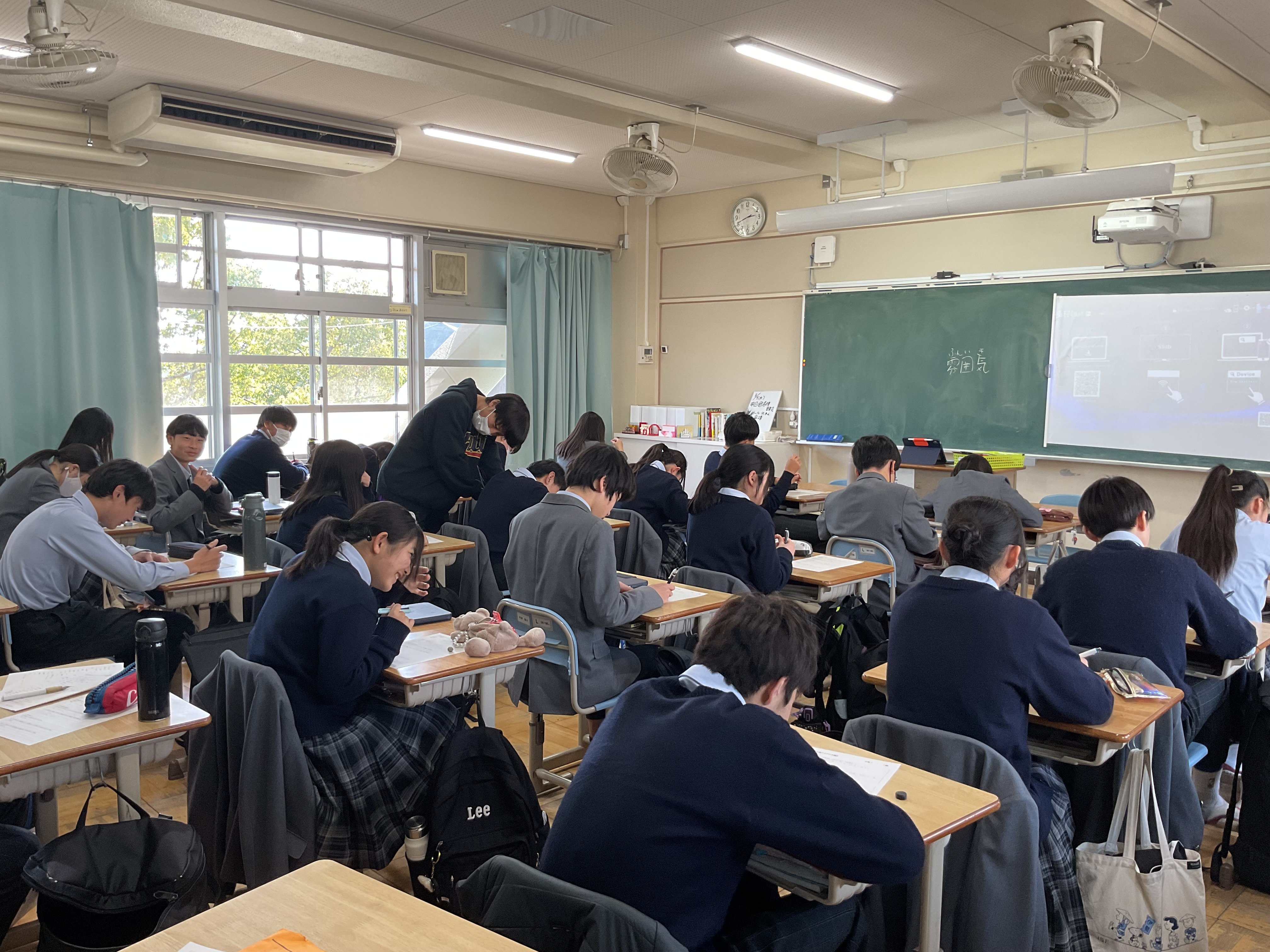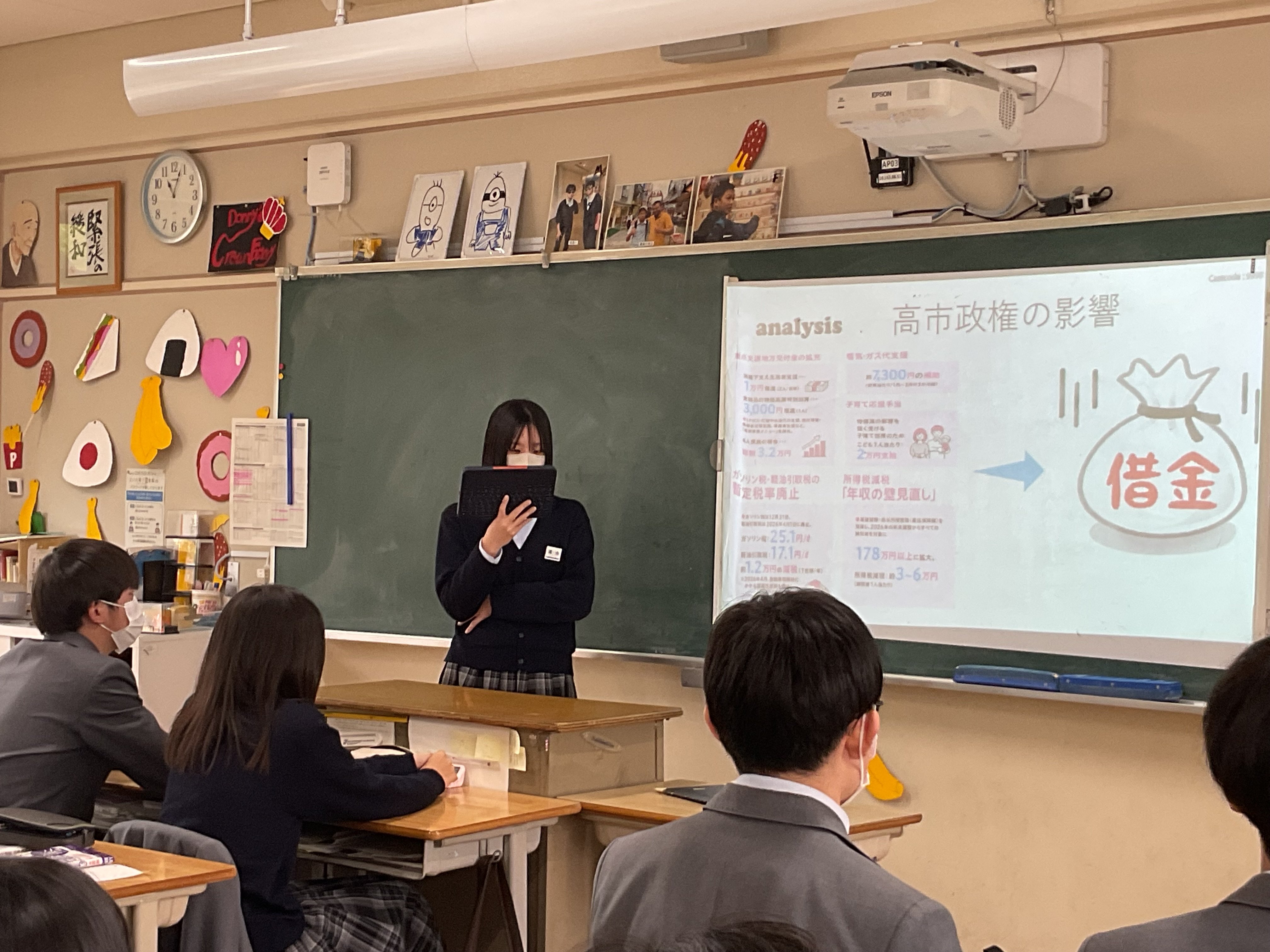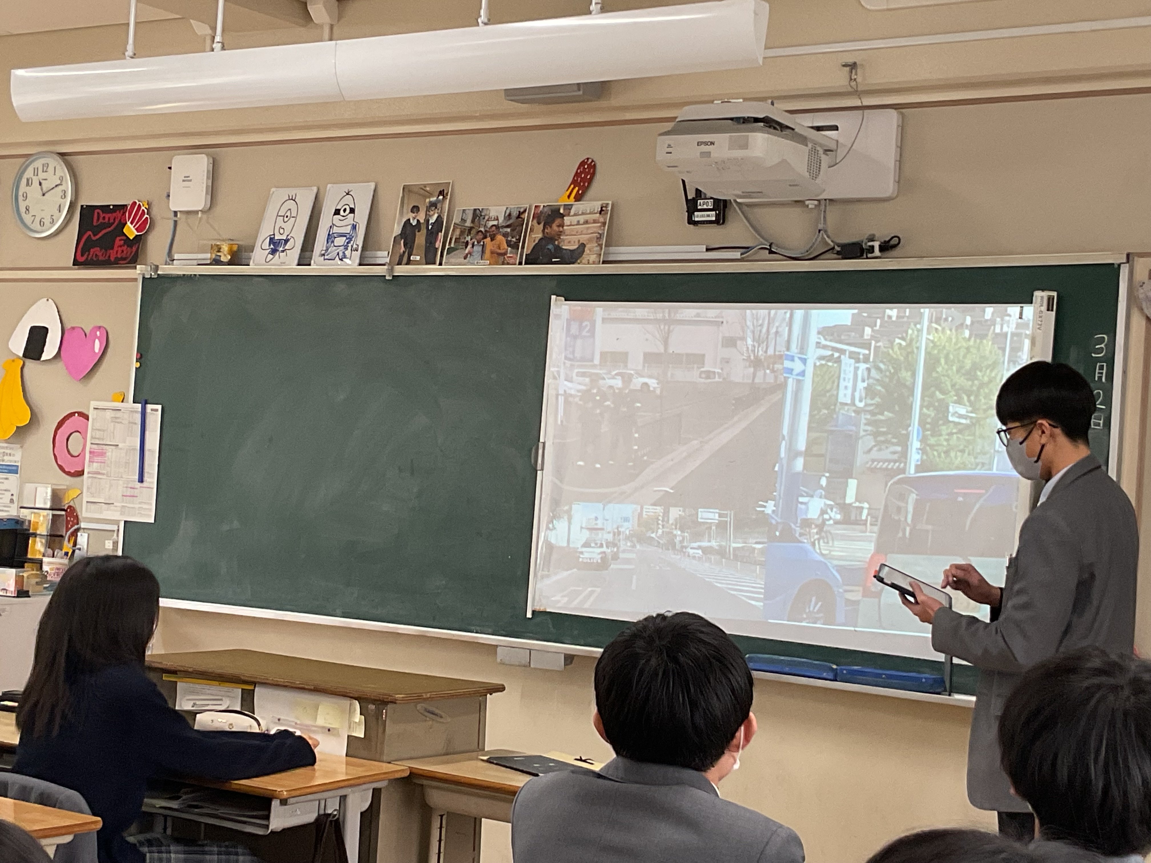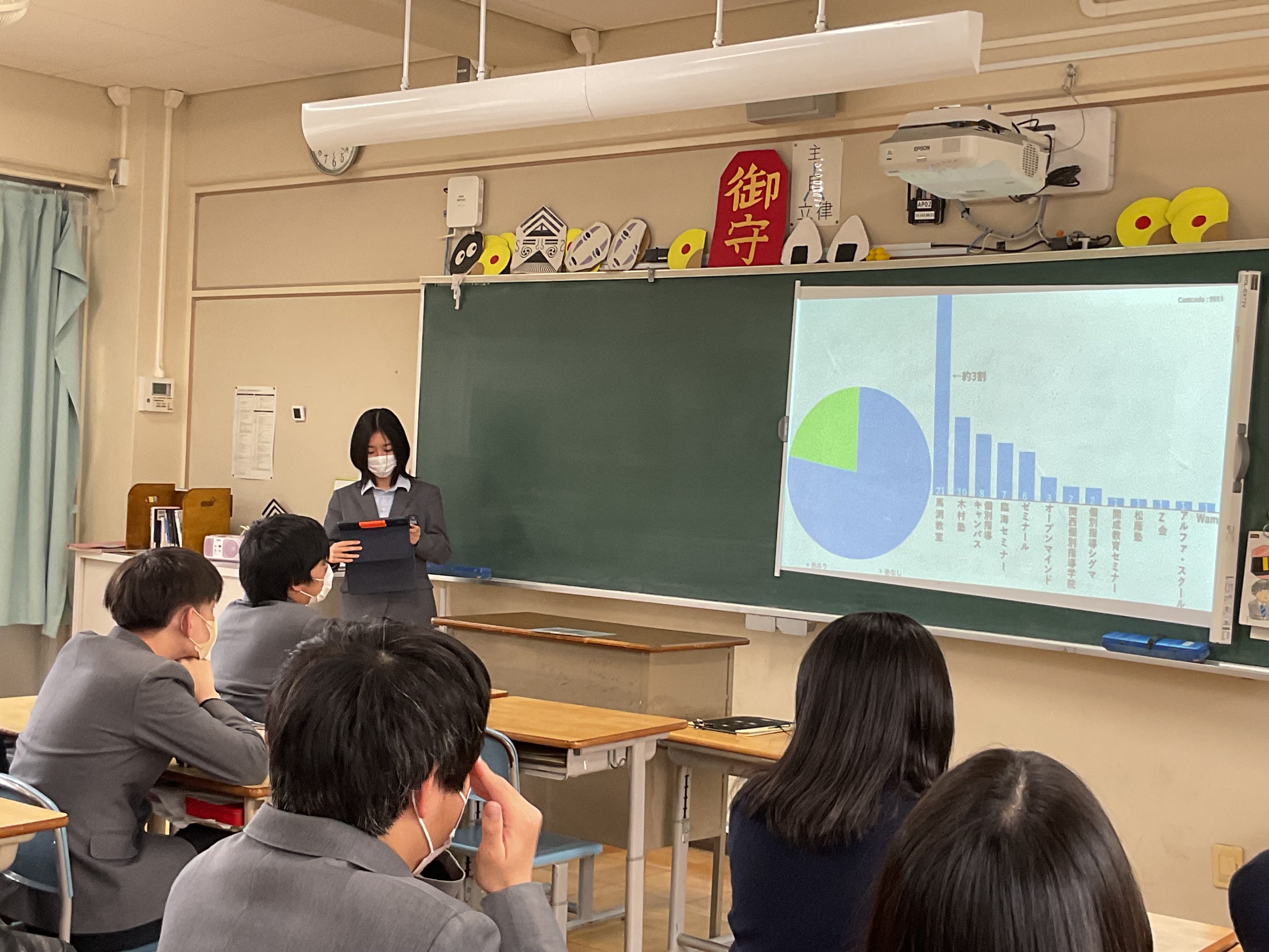 最後の"統計"の単元です。興味ある課題について、データを収集し、分析、考察し、3分間のプレゼンテーションでクラス内共有を行う、ミニ探究を行いました。2回に分けて、全員が発表します。テーマは様々。本校3年生100名ほどに端末でアンケートを行った結果から考察する、国のデータで考察する、など手法も様々です。3年生の睡眠時間、塾、お菓子もあれば、株の動きとディズニーランドの集客数推移、高市政権の影響、校区近くの交通事故についてなど多岐にわたるテーマを取り上げ、語っていました。驚くことに、昨年吹田警察へ要望書をあげて、警察によるパトロールを強化したことで、事故が減っている、との報告もありました。行く末は市政に関わる???頼もしい限りです。