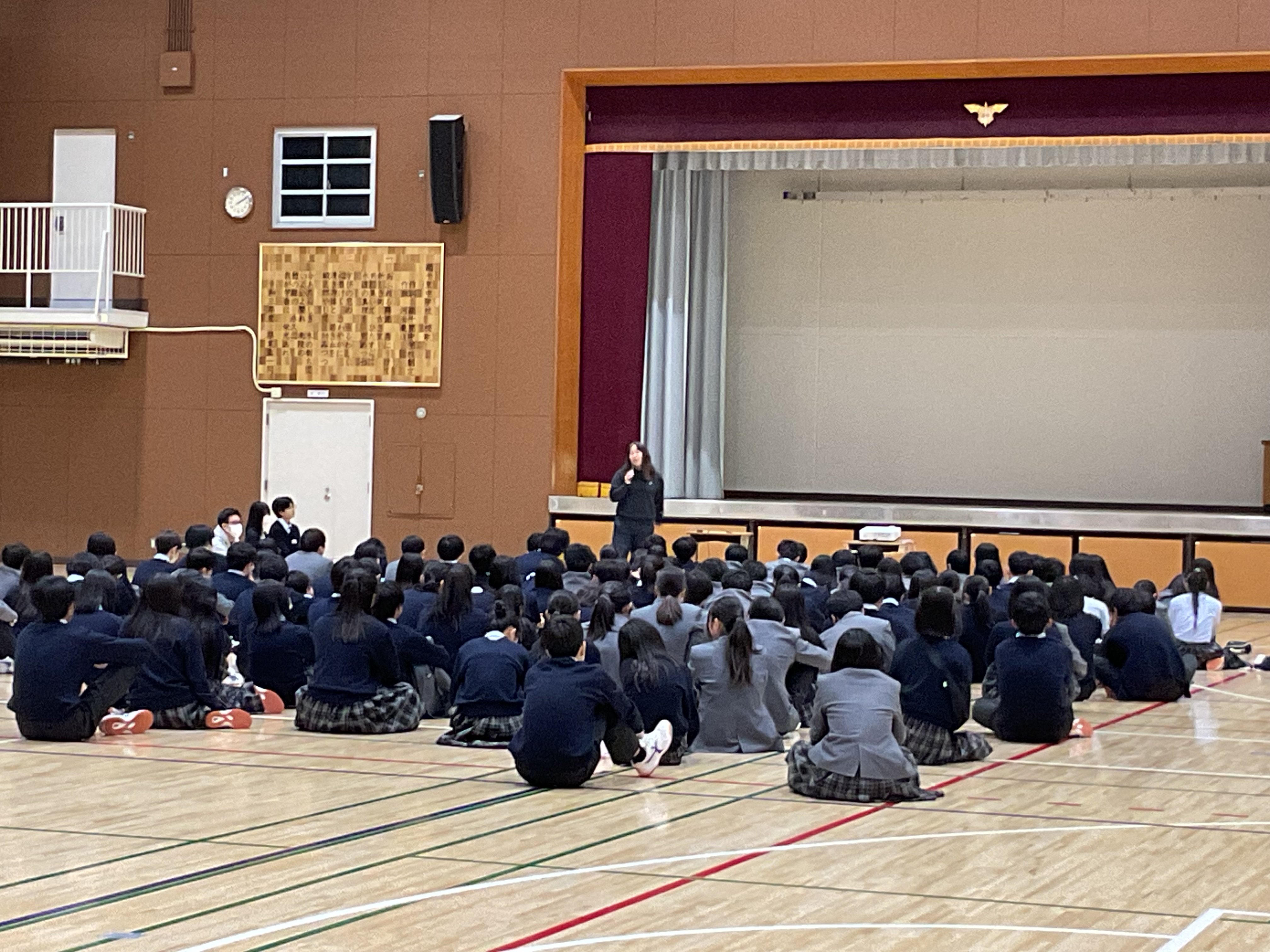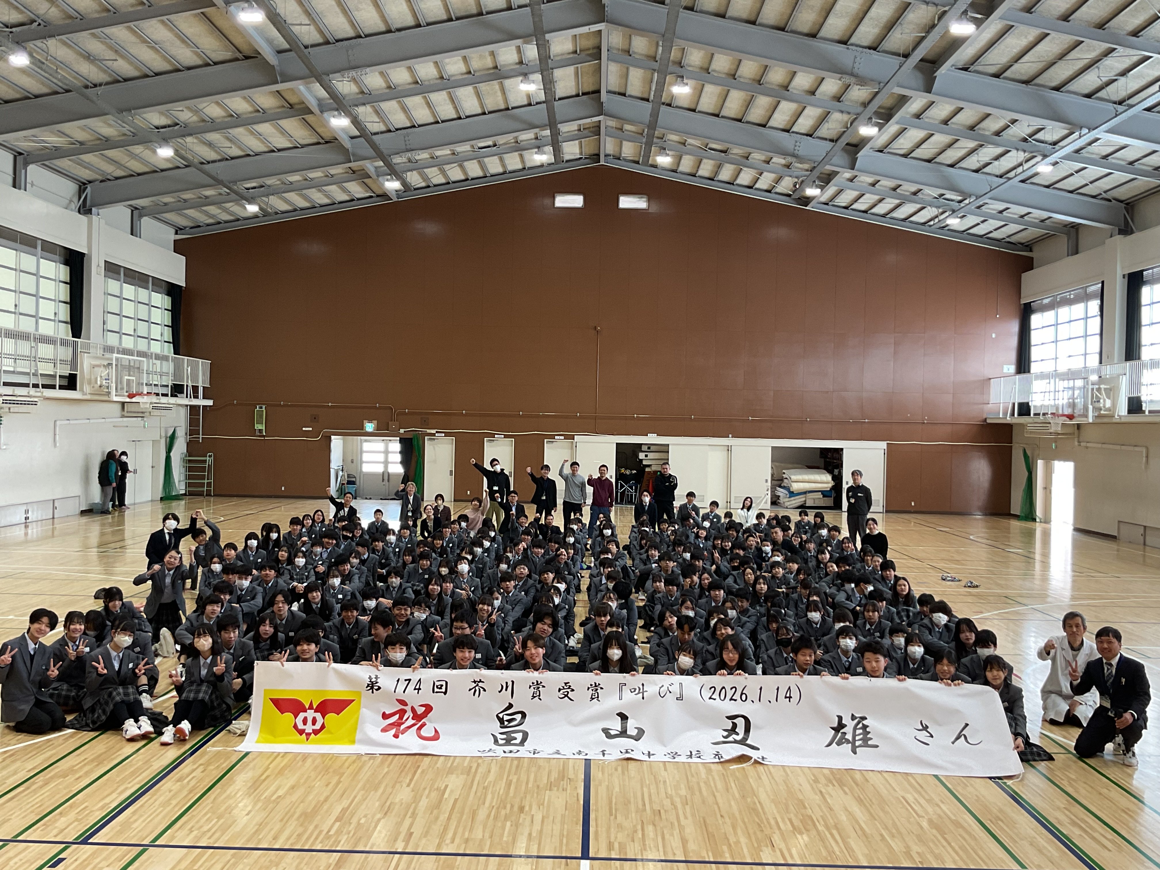 1,2年生のみです。13日の第45回卒業式を支えた2年生へ言葉を添えました。しっかり役割を担い、最高学年を安心して任せそうです。1,2年生それぞれの1年を振り返り、一番の思い出をとなりと伝え合いました。そのほとんどに共通していることは、"いつも仲間がいたからこそ""先生が支えてくれたからこそ"。そうした出会いに感謝し、さらに"I make 南中"→"We make 南中" といった校風を高めていってほしいと語りました。表彰は1年生SDGsジュニアフォーラム銅賞(職員室前に掲示します)、中学生主張大会。式後、生徒指導主事から自主性について改めて考えるお話を、最後に、教育委員会よりご支援いただいた、本校卒業生 畠山丑雄さん芥川賞受賞お祝い幕お披露目式を行いました。記念撮影ではもちろん"(We make) 南中!!"の合言葉の発声。いい締めくくりとなりました。次年度ご講演を予定しています。