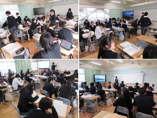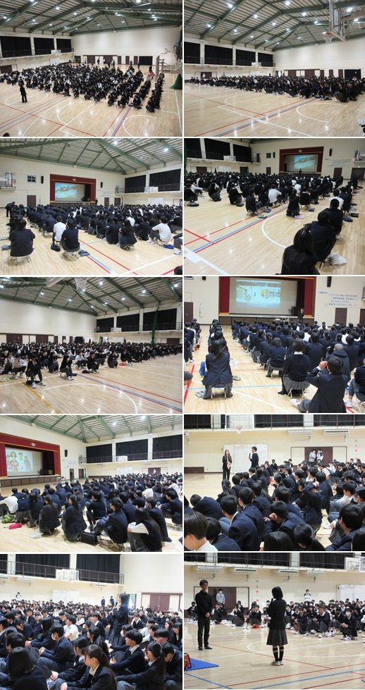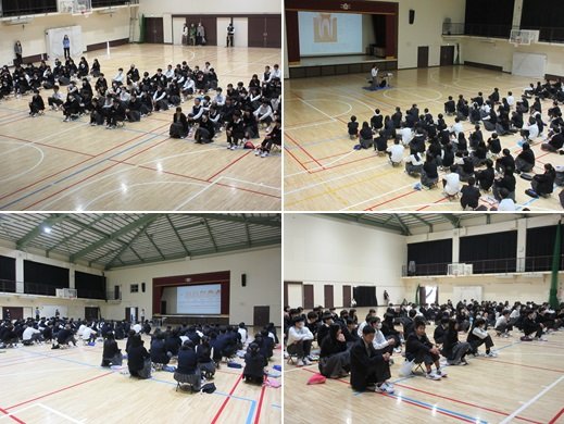 3時間目と4時間目で「人権講演会」を実施しました。フォトジャーナリストの方に来ていただき、「ファインダー越しに見つめる世界~世界の紛争地、被災地から~」と題してお話しいただきました。世界各地で起きている紛争、その中で生きている方々の姿を写真で紹介し、お話しいただきました。最後には、ご自身の出身地である岩手県を襲った、東日本大震災についてのお話もしていただきました。生徒たちも、真剣に聞いていたので、講師の方も話しやすかったと言っていただきました。講演会後の質問も多くあり、講師の方も喜んでくださっていました。最後の「写真家としての喜びは何ですか?」の質問には、色々な場所で人々と出会い、コミュニケーションが取れることが喜びです。と答えられました。この質問は、写真家としてのモチベーションにもつながる質問だったので、有難かった。と話されていました。最後に、後期生徒会会長が生徒代表でお礼の言葉を伝え人権講演会を終えました。