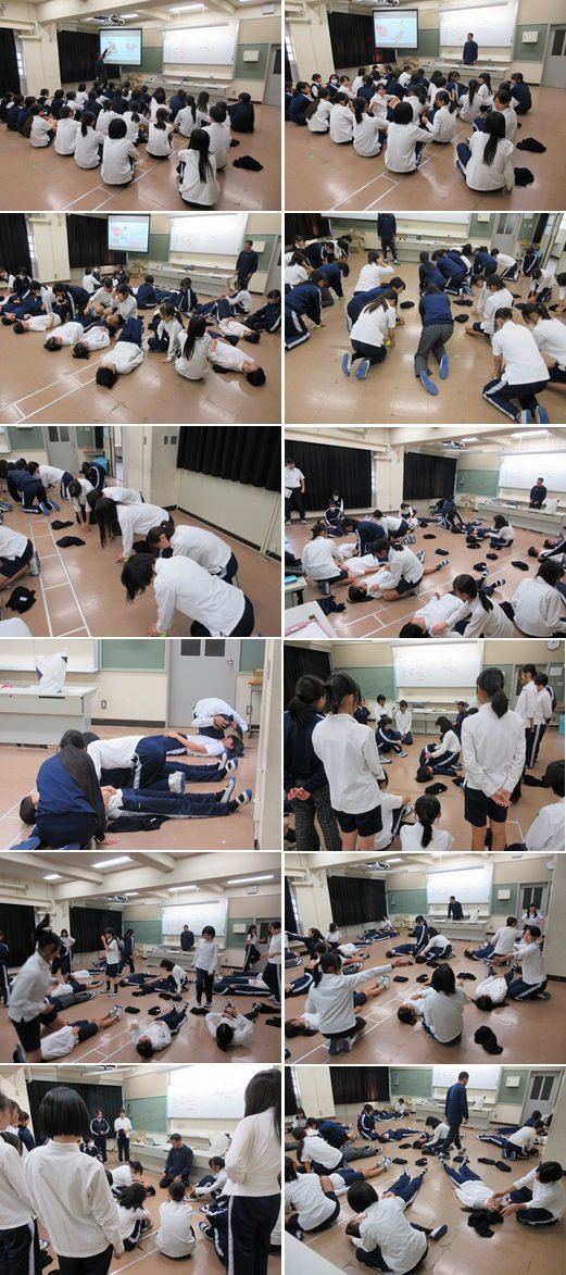 まず、倒れている人を見つけた時の対応法です。呼吸心音確認方法を学び、呼吸停止状態なら心臓マッサージが必要です。硬式テニスボールを使い、心臓マッサージの練習です。「ドラえもん」「アンパンマン」「世界に一つだけの花」等を歌いながらのマッサージをしていました。30秒でもしんどいことを実感しました。その後も、体位回復で嘔吐物で窒息しないようにすることや、今はしなくてよい事にはなっていますが、近しい人にもしもの事があった時の人工呼吸のやり方なども実習していました。