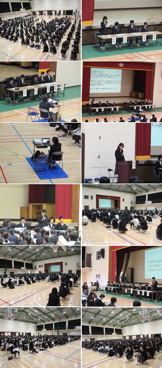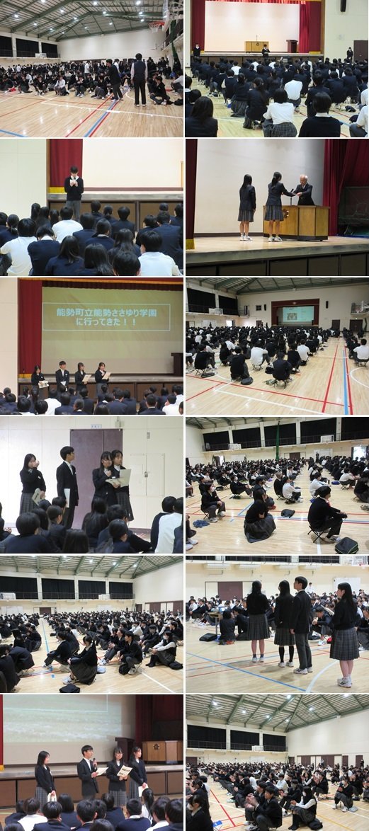 全校集会はここで終わり、前期生徒会が行った「ささゆり学園訪問」の報告会を行いました。10月3日に訪問した、「能勢ささゆり学園」の紹介です。旧府民牧場の跡地を活用している事。能勢町にあった6つの小中学校を1つに統合したので、送迎用のスクールバスを運行していること。校舎のあちこちに虫や爬虫類の飼育箱があったこと。広大な広場がグランドとは別にあること。教室の窓からは「ビル」ではなく「木々の緑」が見える事。等を紹介してくれました。前期生徒会の皆さん、活動ご苦労様でした。後期の生徒会執行部の活動も見守ってくださいね!