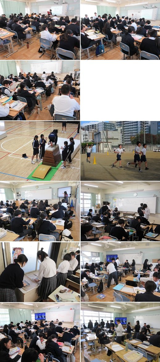 1年生は、随分と学習内容も細かくなってきました。英語もペアを変え会話中心のアクティビティです。社会は歴史分野で、古代大和政権です。2年生は、男子体育が持久走です。自己最高を出そうと頑張って走っていました。女子は跳び箱です。友達の跳んでいる姿を映し再生して自分のフォームを確認していました。3年生の美術はガラス工芸です。透明なガラス1枚1枚にデザインしていき、重ね合わせてみると一つの絵になります。どんな作品になるか楽しみです。数学は、演習問題の教え合い活動をしていました。