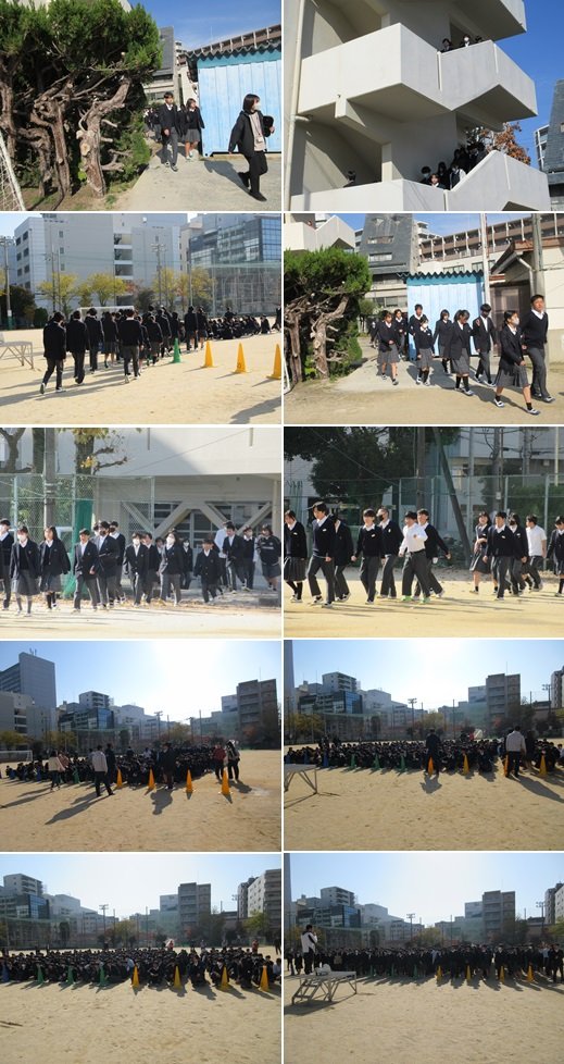 試験終了後、火災想定での避難訓練を実施しました。素早く整然と整列し、非常階段を使用してグランドに避難してきました。6分30秒ほどで点呼も完了です。去年より15秒短縮できました。西階段から集合場所まで距離がある中での時間なので、早く集まれたと評価しました。走らず話さず整然と避難が完了しました。校長からは、「火事で一番恐ろしいのが煙です。特に、この学校の校舎の造りは、階段が煙突の役目を果たしてしまう。5年前の京アニ放火事件も煙が原因で逃げられなかったと報道されていた。慌てず、放送等の指示をよく聞いて避難誘導に従って行動してほしい。まずは自分の命を守る行動を。余裕があれば、助けられる命を助ける行動を心がけて欲しい。」と話がありました。折しも、昨日の香港でのマンション火災も階段が煙突の役割をして被害が拡大したとのことです。また、大分の火事も強風が被害を拡大させてしましました。建物の構造や気象条件でも状況が大きく変わります。万一の時は、最悪の事態を想定して行動するようにしてください。解散後は、美化委員が用紙してくれた雑巾で、上履きを丁寧に下足ホールで拭って校舎ん入っていました。