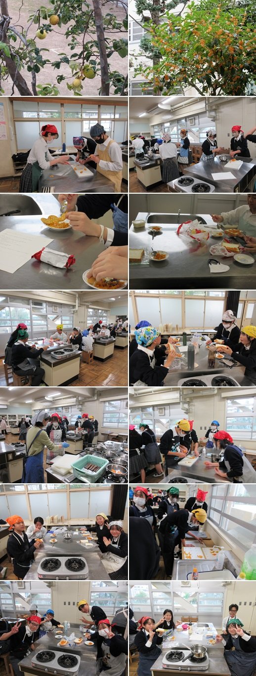 中庭のカリンの木に今年も実が付きました。体育館前のキンモクセイの花が咲き、特有の香りが漂い秋の気配の深まりを感じます。そんな中、プール横のグランド入り口近くの柿の木に実が毎年多く出来るので、その実を使って毎年3年生が調理実習をしています。今年は、柿ジャムに挑戦です。柿の皮を包丁で恐る恐る剥いていました。剥いた皮は評価A(評価規準も説明していました)を目指して提出です。薄く切って、鍋で砂糖と煮込んで出来上がりです。班員分に小皿に分け、各自が持ってきた食材に付けて食していました。「校長先生食べますか?」と聞いてくれたので、いただきました。とても美味しかったです。ありがとう!