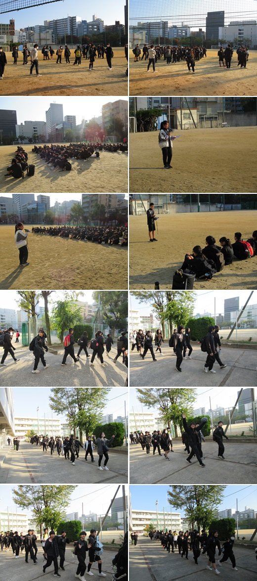 1年生が秋晴れのなか、北千里の「わくわくの郷」への校外学習に出発しました。8時15分頃には、既に多くの生徒が集合場所に登校していました。学校始業の8時30分に出発式を、校外学習委員の生徒の司会進行で始まりました。校長挨拶では①全員無事に解散式が出来るようにしてください。②公共を意識した行動を取りましょう。③今日一日「いい学び」が出来るようにし、「集団として成長できる」行事にして欲しいと話がありました。次に、生徒から諸注意があり、出発しました。見送りに何人か先生も来てくださるなか、元気に手を振って出発していきました。