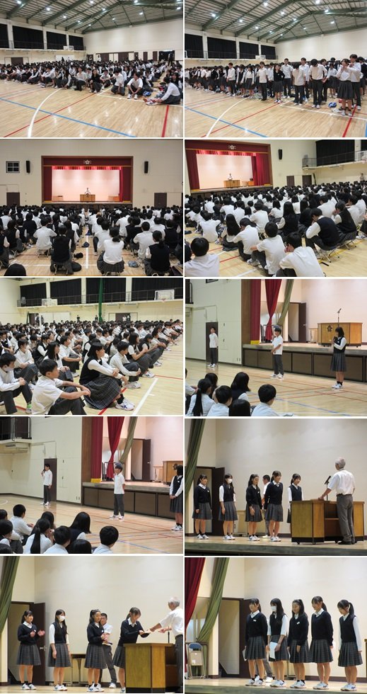 6時間目は全校集会です。いつも通りチャイム前に整列完了で、校長からの話もチャイムが鳴り終わるのを待ってからです。校長からは「ファーストペンギンとセカンドペンギン」の話で、「ファーストペンギンとセカンドペンギン」が出てきやすいこの豊津西中学校の雰囲気を続けて、「体育大会」も成功させましょう!と話がありました。続いて、各学年の学級委員から「月目標」の発表です。「折り返しを過ぎたので初心に戻る」「体育大会に向けて」「最後は始まり」など、各学年の特色が出た目標でした。最後に「食育キャッチフレーズ」の表彰状が吹田市教育委員会から届いたので、伝達表彰を行い全校集会を終えました。