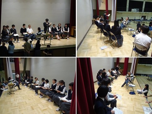 明日の生徒総会に向け、放課後体育館のステージでは、生徒会執行部・各委員会委員長が集まって、リハーサルを行っていました。本番どおり司会進行を立て、マイクも持って話していました。前期生徒会の皆さん、明日は頑張ってください!