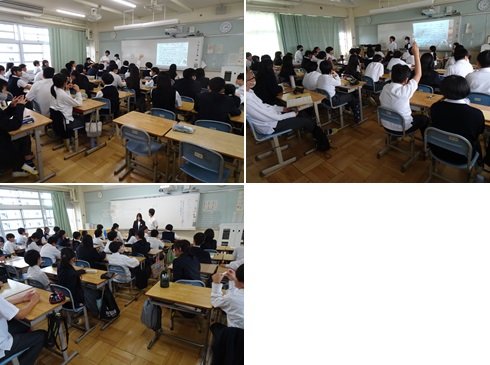 1年生は、5時間目までで下校し、2,3年生の授業を本校校区の小学校の先生方にも来ていただき、「確かな学びを育む推進校」として、「教科の学びをアウトプットする力を育てる」ことを目標に、授業を公開しました。事前に各教科で先生方が集まり、今回の授業について考えての授業でした。小学校時代に教えてもらった先生も来られていたので、嬉恥ずかしそうにしている生徒もいました。