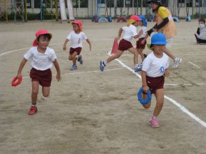 5歳児は、体育館でもリレーをして、先ほどのリベンジ!